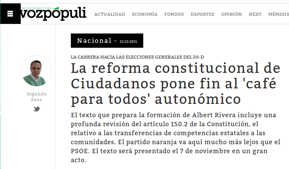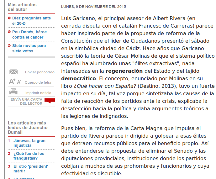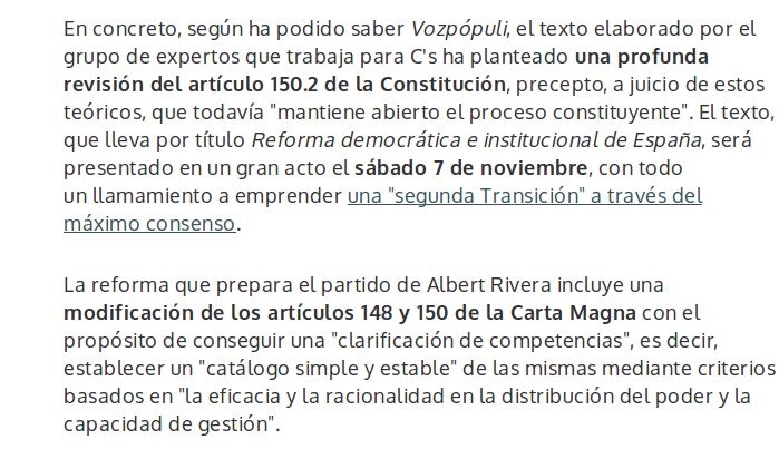 Luis Garicano, el principal asesor de Albert Rivera parece haber inspirado parte de la propuesta de reforma de la Constitución que el líder de Ciudadanos presentó en la simbólica ciudad de Cádiz.Pues bien, la reforma de la Carta Magna que impulsa el partido deRivera parece ir dirigida a golpear a esas élites que detraen recursos públicos para el beneficio propio. Así debe entenderse la propuesta de eliminar el Senado y las diputaciones provinciales, instituciones donde los partidos cobijan a muchos de sus prohombres y funcionarios y cuya efectividad es discutible.( El texto que prepara la formación de Albert Rivera incluye una profunda revisión del artículo 150.2 de la Constitución, el relativo a las transferencias de competencias estatales a las comunidades. El partido naranja va aquí mucho más lejos que el PSOE.Uno de los puntos centrales de la propuesta de reforma constitucional que ultima Ciudadanos es el fin del controvertido café para todos autonómico, el primitivo sistema de transferencias de competencias estatales a las comunidades que no terminó de ser acotado en la redacción de la Carta Magna de 1978. La reforma que prepara el partido de Albert Rivera incluye una modificación de los artículos 148 y 150 de la Carta Magna con el propósito de conseguir una "clarificación de competencias""Lo primero es proponer un proyecto para España, ver qué reformas necesita el país y valorar si es necesario tocar la Constitución", explicó Fernando de Páramo, secretario de Comunicación. "Es más importante cumplirla que cambiarla", añadió. "Lo que no se puede hacer es engañar a los ciudadanos diciendo que la reforma de la Constitución solucionaría todos los problemas. ¿Acabaría con la corrupción? Poco tiene que ver con eso", siguió. "¿Hacen faltas correcciones y equilibrios? Sí. Hay artículos que requieren puntualizaciones, y otros incluso cambios".