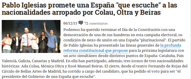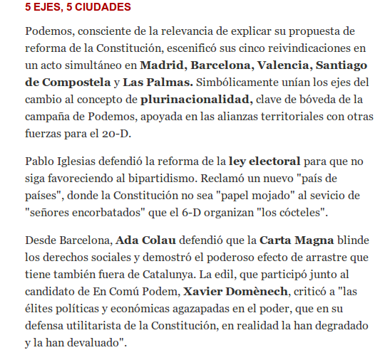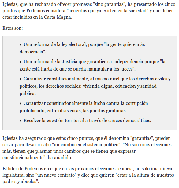 PODEMOS: Pablo Iglesias convocó una huelga el pasado 6 de diciembre por la reforma constitucional redactando una carta a la ciudadanía: "La Constitución de 1978 supuso un avance democrático sin precedentes en nuestro país, pero a día de hoy, los acontecimientos de los últimos años han mostrado la necesidad de avanzar..."Pablo Iglesias se puso corbata para defender la reforma constitucional que propugna Podemos. Pablo Iglesias defendió la reforma de la ley electoral para que no siga favoreciendo al bipartidismo. Reclamó un nuevo "país de países", donde la Constitución no sea "papel mojado" al sevicio de "señores encorbatados" Estas son las cinco propuestas que ofrece Pablo Iglesia para una reforma constitucional: Una reforma de la ley electoral, porque "la gente quiere más democracia". Una reforma de la Justicia que garantice su independencia porque "la gente está harta de que se pueda manipular a los jueces". Garantizar constitucionalmente, al mismo nivel que los derechos civiles y políticos, los derechos sociales: vivienda digna, educación y sanidad pública. Garantizar constitucionalmente la lucha contra la corrupción prohibiendo, entre otras cosas, las puertas giratorias. Resolver la cuestión territorial a través de cauces democráticos.