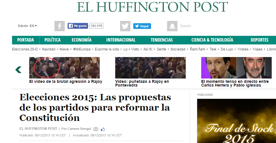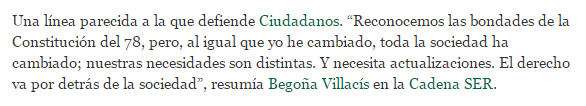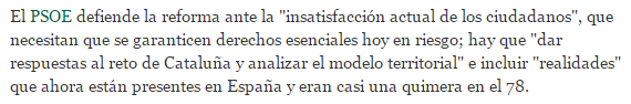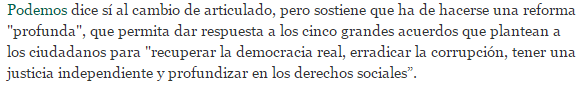 REFORMA CONSTITUCIONAL : La reforma de la Constitución española es el procedimiento por el que se modifica el texto constitucional siguiendo los trámites establecidos por la propia Constitución a tal efecto. Título X. De la reforma constitucional: Artículo 166 : La iniciativa de reforma constitucional se ejercerá en los términos previstos en los apartados 1 y 2 del artículo 87. Artículo 167 : - Los proyectos de reforma constitucional deberán ser aprobados por una mayoría de tres quintos de cada una de las cámaras. Si no hubiera acuerdo entre ambas, se intentará obtenerlo mediante la creación de una comisión de composición paritaria de diputados y senadores, que presentará un texto que será votado por el congreso y el senado.- De no lograrse la aprobación mediante el procedimiento del apartado anterior, y siempre que el texto hubiere obtenido el voto favorable de la mayoría absoluta del Senado, el Congreso, por mayoría de dos tercios, podrá aprobar la reforma.- Aprobada la reforma por las Cortes Generales, será sometida a referéndum para su ratificación cuando así lo soliciten, dentro de los quince días siguientes a su aprobación, una décima parte de los miembros de cualquiera de las Cámaras.Artículo 168 :- Cuando se propusiere la revisión total de la Constitución o una parcial que afecte al Titulo preliminar, al Capítulo segundo, Sección primera del Título I, o al Título II, se procederá a la aprobación del principio por mayoría de dos tercios de cada Cámara, y a la disolución inmediata de las Cortes.- Las Cámaras elegidas deberán ratificar la decisión y proceder al estudio del nuevo texto constitucional, que deberá ser aprobado por mayoría de dos tercios de ambas Cámaras.- Aprobada la reforma por las Cortes Generales, será sometida a referéndum para su ratificación.Artículo 169 :No podrá iniciarse la reforma constitucional en tiempo de guerra o de vigencia de alguno de los estados previstos en el artículo 116.
