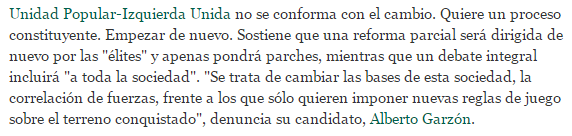 CUATRO PARTIDOSPRINCIPALES :* PSOE ( Partido Socialista Obrero Español ) : Es un partido político español que en el espectro político se sitúa en el centroizquierda, cuyo secretario general es Pedro Sánchez Pérez-Castejón. Fue fundado en 1879 por Pablo Iglesias, y durante cien años se definió como un partido de clase obrera, socialista marxista hasta que en 1979, en el 28.º Congreso del partido, aceptó la economía de mercado, renunciando a toda relación con el marxismo. Se convirtió en uno de los dos partidos políticos mayoritarios de España. * PP ( Partido Popular ) : Es un partido político conservador español situado en el centro derecha o la derecha política. Fue fundado en 1989, cuando adoptó su denominación actual, que sustituyó a la de Alianza Popular. En efecto, el concepto de partido político y, en especial, la palabra "partido", habían despertado y mantenido una fuerte repulsión durante el franquismo, siendo ampliamente denostados y perdurando incluso hasta bien entrado el tardofranquismo a principios de 1975. De ahí que el denominado Partido Popular naciera como alianza, para evitar susceptibilidades conceptuales.* IU ( Izquierda Unidas ) :Es un movimiento político y social español formado en 1986 e inscrito como federación en el Registro de Partidos Políticos desde noviembre de 1992. Su objetivo es la transformación social hacia un sistema socialista democrático, fundamentado en los principios de justicia, igualdad y solidaridad, y organizado conforme a un Estado laico, federal y republicano.* PODEMOS :Es un partido político español fundado en enero de 2014, cuyo secretario general es Pablo Iglesias Turrión.Cuatro meses después de su formación, Podemos participó en las elecciones europeas de 2014, logrando cinco escaños (de 54) con el 7,98 % de los votos, lo que lo convirtió en el cuarto partido más votado de España. En los primeros veinte días que permitió la inscripción, reunió más de 100 000 miembros, convirtiéndose en el tercer partido en número de afiliados y en octubre ostentaba ya el segundo lugar, con más de 200 000. También llegó a aparecer como el primer partido del país en intención directa de voto, según las encuestas.