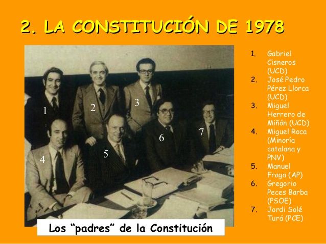 INTRODUCCIÓN HISTÓRICALa transición a la democracia tuvo lugar como consecuencia de la muerte del general y dictador, Francisco Franco el 20 de Noviembre de 1975. Esto precipitó una serie de cambios políticos e históricos. Dos días después se produce la proclamación de Juan Carlos I.En Julio de 1976, Juan Carlos I le encargó a Adolfo Suárez la formación del segundo gobierno de su reinado y el desmontaje de las estructuras franquistas. Con 43 años consiguió reunir a socialdemócratas, liberales, democristianos, etc... Desarboló el régimen franquista con ayuda de fuerzas antifranquistas como el PSOE y, especialmente, del Partido Comunista de España. El 15 de junio de 1997 se realizaron las primeras elecciones generales libres. Las cortes salidas de aquellas elecciones , aprobaron la Constitución que el pueblo español refrendaba el 6 de Diciembre de 1978