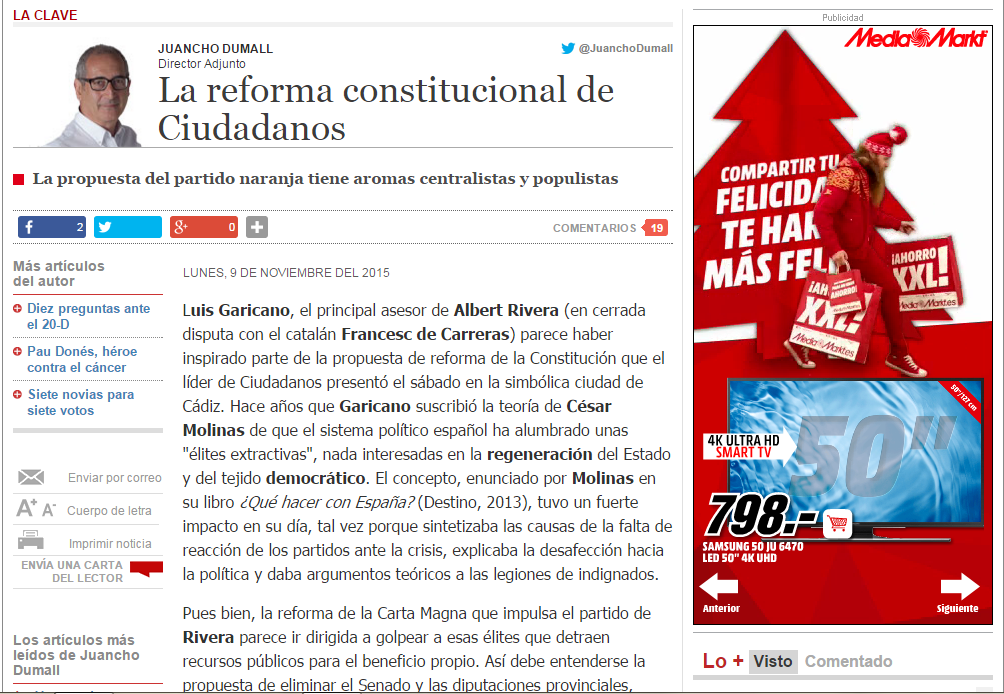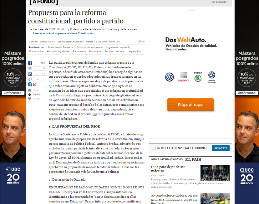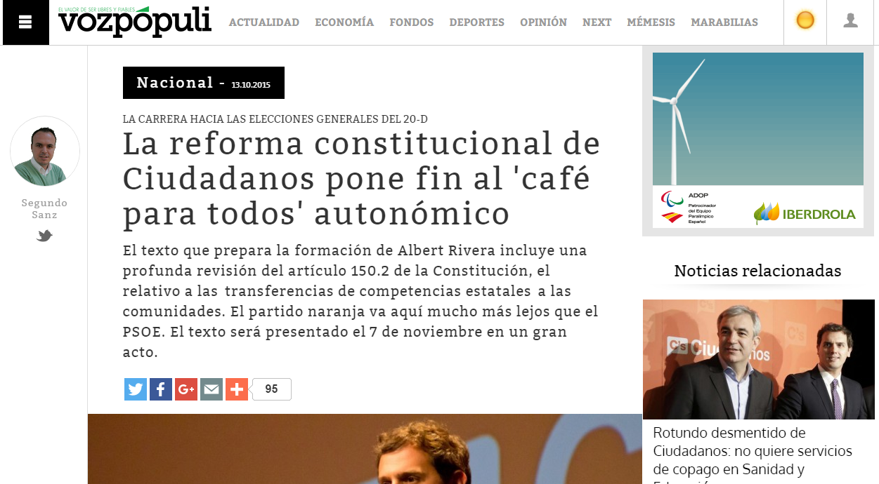 -Ciudadanos:Uno de los puntos centrales, de la propuesta de reforma constitucional que ultima Ciudadanos es el fin del controvertido café para todos autonómico, el primitivo sistema de transferencias de competencias estatales a las comunidades que no terminó de ser acotado en la redacción de la Carta Magna de 1978.Propuestas: Eliminar el Senado y las diputaciones provinciales Modificación de los artículos 148 y 150 de la Carta Magna con el propósito de conseguir una "clarificación de competencias". Nuevo sistema de financiación autonómica, inspirado en el modelo alemán. Eliminación de los «privilegios forales». Reconocimiento en la Carta Magna la pertenencia de España a la Unión Europea.