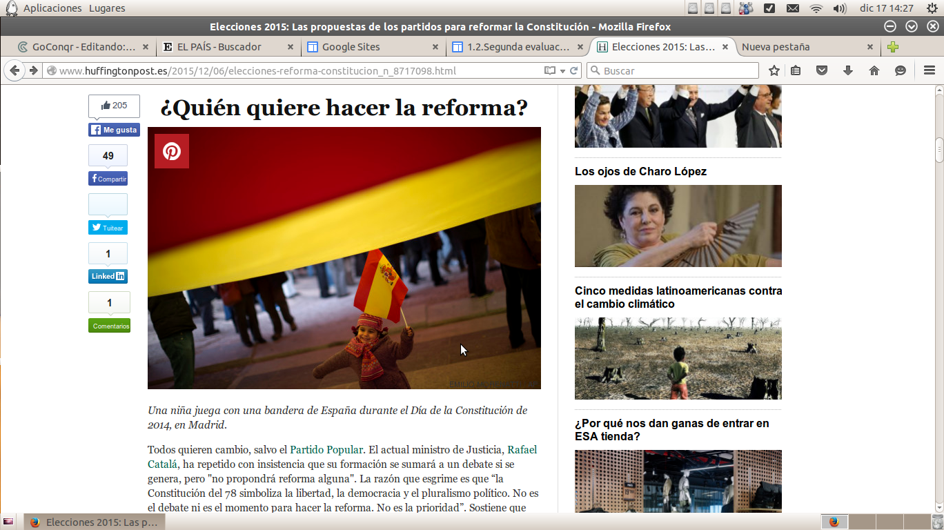 3.- TRABAJO DE INVESTIGACIÓN. Propuesta general de todos los partidos:Todos quieren cambio, salvo el Partido Popular. El actual ministro de Justicia, Rafael Catalá, ha repetido con insistencia que su formación se sumará a un debate si se genera, pero "no propondrá reforma alguna". La razón que esgrime es que “la Constitución del 78 simboliza la libertad, la democracia y el pluralismo político. No es el debate ni es el momento para hacer la reforma. No es la prioridad”. Sostiene que "no lo demanda la sociedad" y que mejoras en derechos o funcionamiento de instituciones, en las que los demás fundamentan su deseo de cambio, se pueden llevar a cabo por otras vías. El PSOE defiende la reforma ante la "insatisfacción actual de los ciudadanos", que necesitan que se garanticen derechos esenciales hoy en riesgo; hay que "dar respuestas al reto de Cataluña y analizar el modelo territorial" e incluir "realidades" que ahora están presentes en España y eran casi una quimera en el 78. Una línea parecida a la que defiende Ciudadanos. “Reconocemos las bondades de la Constitución del 78, pero, al igual que yo he cambiado, toda la sociedad ha cambiado; nuestras necesidades son distintas. Y necesita actualizaciones. El derecho va por detrás de la sociedad”, resumía Begoña Villacís en la Cadena SER. Misma senda que sigue UPyD, que defiende sólo tocando la Carta Magna se podrá estabilizar el modelo territorial, cambiar la ley electoral o mejorar la eficiencia de determinadas instituciones. Podemos dice sí al cambio de articulado, pero sostiene que ha de hacerse una reforma "profunda", que permita dar respuesta a los cinco grandes acuerdos que plantean a los ciudadanos para "recuperar la democracia real, erradicar la corrupción, tener una justicia independiente y profundizar en los derechos sociales”. Unidad Popular-Izquierda Unida no se conforma con el cambio. Quiere un proceso constituyente. Empezar de nuevo. Sostiene que una reforma parcial será dirigida de nuevo por las "élites" y apenas pondrá parches, mientras que un debate integral incluirá "a toda la sociedad". "Se trata de cambiar las bases de esta sociedad, la correlación de fuerzas, frente a los que sólo quieren imponer nuevas reglas de juego sobre el terreno conquistado", denuncia su candidato, Alberto Garzón.