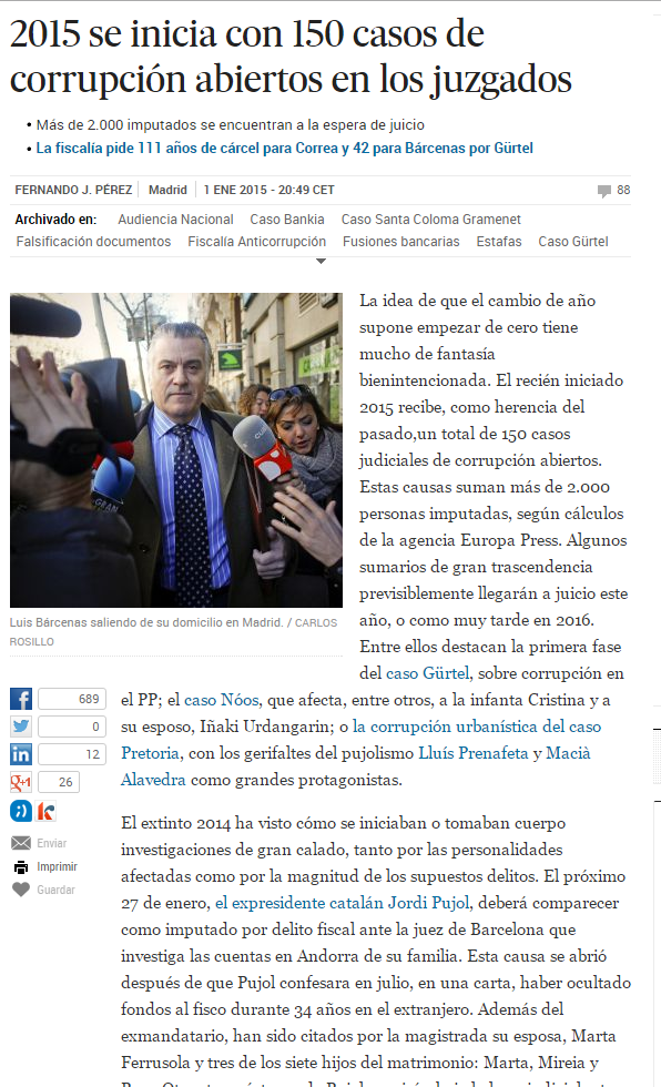 COMENTARIO/ CRÍTICA SOBRE LA CORRUPCIÓN POLÍTICAUrdangarin y la infanta Cristina, bajo sospecha. Bárcenas, en la cárcel por ladrón. Matas, en la cárcel por lo mismo. Jordi Pujol, defraudador confeso. Aguirre, infractora a la fuga. Cañete, machista. León de la Riva, machista reincidente. La sede del partido político que nos gobierna, registrado por la policía. Gobiernos de Valencia y Andalucía, en tela de juicio por las irregularidades del pasado más reciente. Una pléyade de alcaldes, concejales, consejeros, directores generales, imputados. Cientos de cargos públicos con cargos sobre ellos, pero libres la mayor parte, sin fianza alguna. Decenas de casos: Gürtel, ERE, Nóos, Brugal, Fabra, Pokémon, Palma Arena, Pallerols, Millet, Malaya, ITV, Baltar, etc.Y nosotros tenemos a estos tipos por personas, que supuestamente miran por nuestro país. Hay cargos políticos creados, que verdaderamente no sirven para nada, es más, solo sirven para sangrar al país. Mientras España sufre una crisis de la que "tenemos que salir", hay personas que se hacen ricas a costa de las personas que menos tienen.