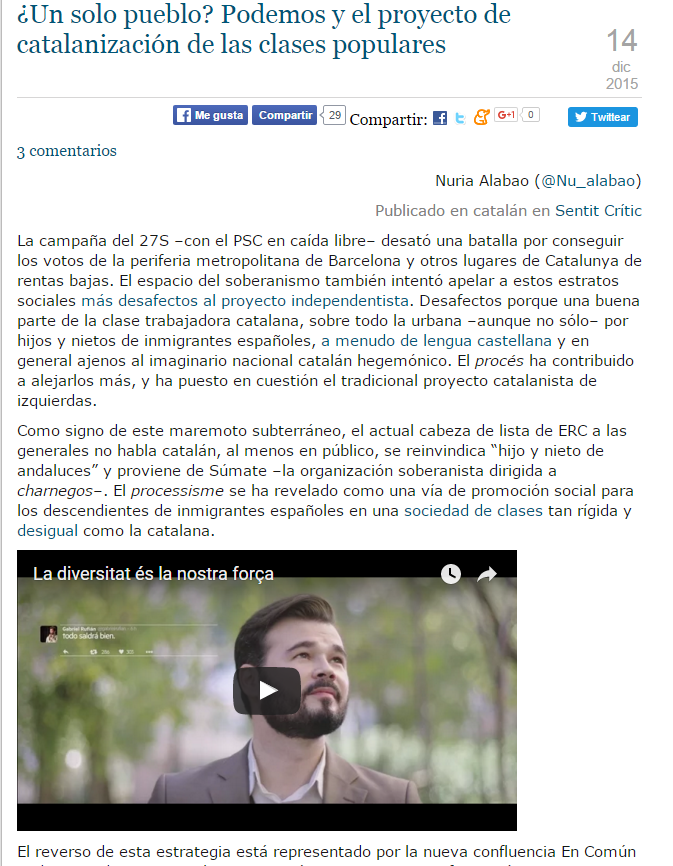 COMENTARIO/ CRÍTICA SOBRE CATALUÑALos nacionalistas catalanes han considerado que es el momento más oportuno para plantear la independencia de Cataluña, aprovechando la crisis de España. Pero también hay que decir, que Cataluña ha llegado a ser lo que es, gracias a España, y que sin su ayuda no lo hubiera conseguido, Tampoco está bien que después de todo lo que ha hecho España por ella decidan separarse de ésta.