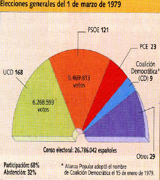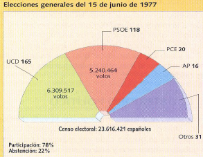 En febrero de 1977 se había firmado una nueva ley electoral que aceptaba el sufragio universal, libre, directo y la representación proporcional.Las primeras elecciones democráticas se celebraron el 15 de junio de 1977 y dieron la victoria a la UCD (Unión de Centro Democrático) de Adolfo Suárez, la segunda fuerza más votada fue el PSOE (Felipe González y Alfonso Guerra).