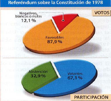 Tras su debate en el Congreso y en el Senado, el texto final fue aprobado en el Pleno del Congreso de los Diputados por 316 votos a favor, 6 en contra y 3 abstenciones. Finalmente, el Proyecto de Constitución fue sometido a referéndum de los ciudadanos el 6 de diciembre de 1978. La Constitución quedó aprobada con un 87,87% de votos afirmativos.