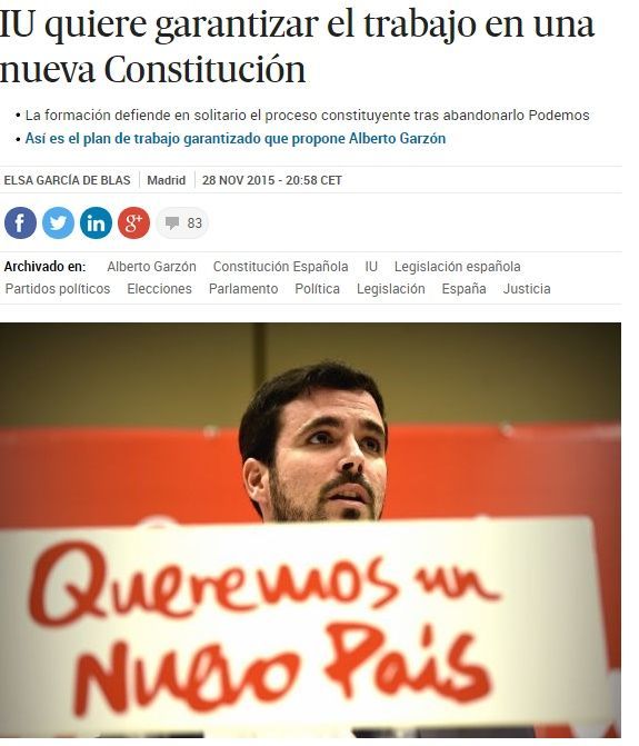IU: Incorporar la sanidad, el derecho a la vivienda y el derecho al trabajo como derechos fundamentales de la persona. Proponen como modelo de estado la república federal con la igualdad entre territorios garantizada por la Constitución. Eliminación de la discriminación a la mujer en los mecanismos de sucesión de la Corona que establece la Constitución. Modificación del artículo 15 de la Constitución para constitucionalizar la Ley de plazos del aborto. Supresión o modificación del artículo 155, que autoriza al Estado a tomar "las medidas necesarias" si una comunidad autónoma actúa contra las leyes o contra el interés general. Artículo del país.