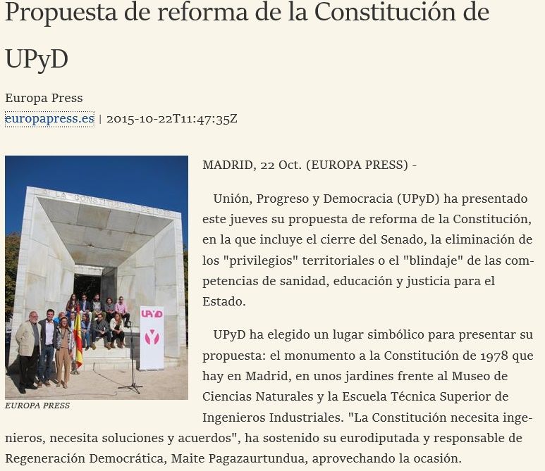 UPyD: Reforma del régimen electoral para establecer a través de la Constitución un sistema proporcional que garantice la igualdad de valor del voto. El nuevo sistema deberá ajustarse al principio constitucional de que el voto de los ciudadanos valga igual en cualquier parte del territorio. Nuevos derechos reconocidos en la Constitución de igualdad de trato y no discriminación, también el derecho al acceso a la información pública y a la calidad medioambiental. Laicismo y neutralidad del Estado en materia de creencias religiosas, identitarias e ideológicas. Prevenir la discriminación por motivos lingüísticos y evitar que las comunidades puedan erradicar la cooficialidad del español en la educación. Para eso se incluirá después de la palabra raza, la palabra lengua en el artículo 14 de la Constitución. Se suprimirá la discriminación por razón de sexo del artículo 57.1 en la sucesión de la Corona.