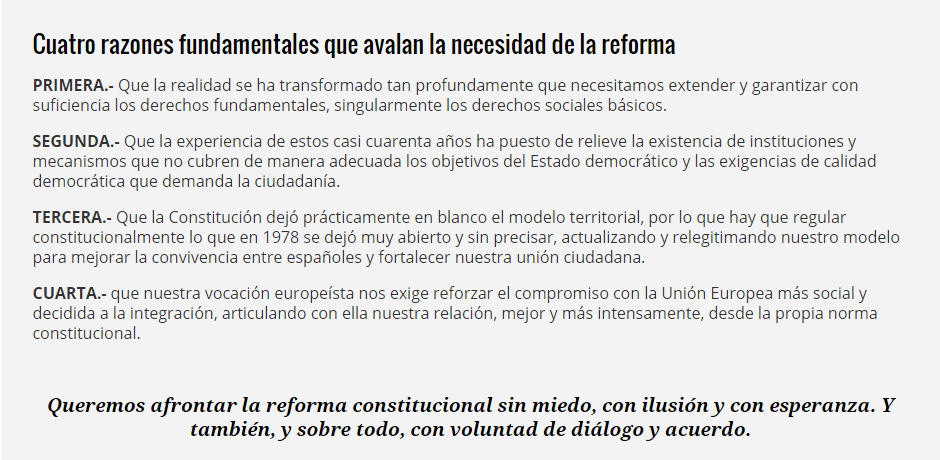 PSOE: Este es el partido político que más propuestas de reforma constitucional hace. Reconocer como derechos fundamentales los derechos a la protección de la salud y reconocer el derecho a una renta o ingreso mínimo vital ante situaciones de carencia efectiva para el mantenimiento de una vida digna. Dotar de contenido el derecho a la vivienda mediante la previsión de obligaciones concretas para los poderes públicos, especialmente en casos de desahucio. Reforzar los derechos medioambientales y así reforzar la Alianza Intergeneracional. Incorporar a la Constitución una regulación expresa y específica de la igualdad entre mujeres y hombres. Eliminar la preferencia del varón sobre la mujer en la sucesión a la Corona. Facilitar el voto de los ciudadanos extranjeros. Permitir el derecho al matrimonio entre personas del mismo sexo. Rebajar las condiciones para presentar una iniciativa legislativa popular y dar posibilidad a sus promotores de acceder a la sede parlamentaria en defensa de sus propuestas. Incluir en la Constitución a las Comunidades Autónomas por su nombre. Incorporar la referencia a la autonomía de las Ciudades de Ceuta y Melilla. Mejorar el régimen de cooficialidad de las lenguas de España con el objetivo de establecer su reconocimiento como lenguas del Estado y la garantía de la libertad de uso. Atribuir al Estado la garantía de la igualdad de todos los españoles en sus condiciones básicas de vida, en el disfrute de los servicios básicos esenciales, en el ejercicio de los derechos y libertades y en el cumplimiento de los deberes, así como la igualdad en el territorio en el que se resida. Web del PSOE con las propuestas.