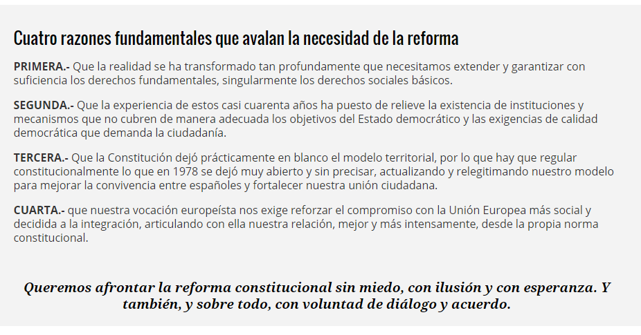 PSOE: Defiende la reforma ante la "insatisfacción actual de los ciudadanos", que necesitan que se garanticen derechos esenciales hoy en riesgo; hay que "dar respuestas al reto de Cataluña y analizar el modelo territorial" e incluir "realidades" que ahora están presentes en España y eran casi una quimera en el 78.http://www.psoe.es/propuestas/reforma-constitucional/