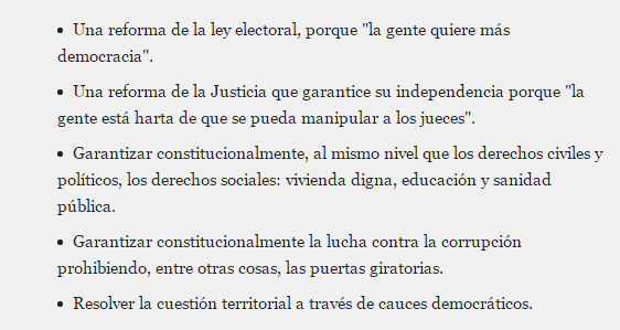 IU: No se conforma con el cambio. Quiere un proceso constituyente. Empezar de nuevo. Sostiene que una reforma parcial será dirigida de nuevo por las "élites" y apenas pondrá parches, mientras que un debate integral incluirá "a toda la sociedad". "Se trata de cambiar las bases de esta sociedad, la correlación de fuerzas, frente a los que sólo quieren imponer nuevas reglas de juego sobre el terreno conquistado", denuncia su candidato, Alberto Garzón.