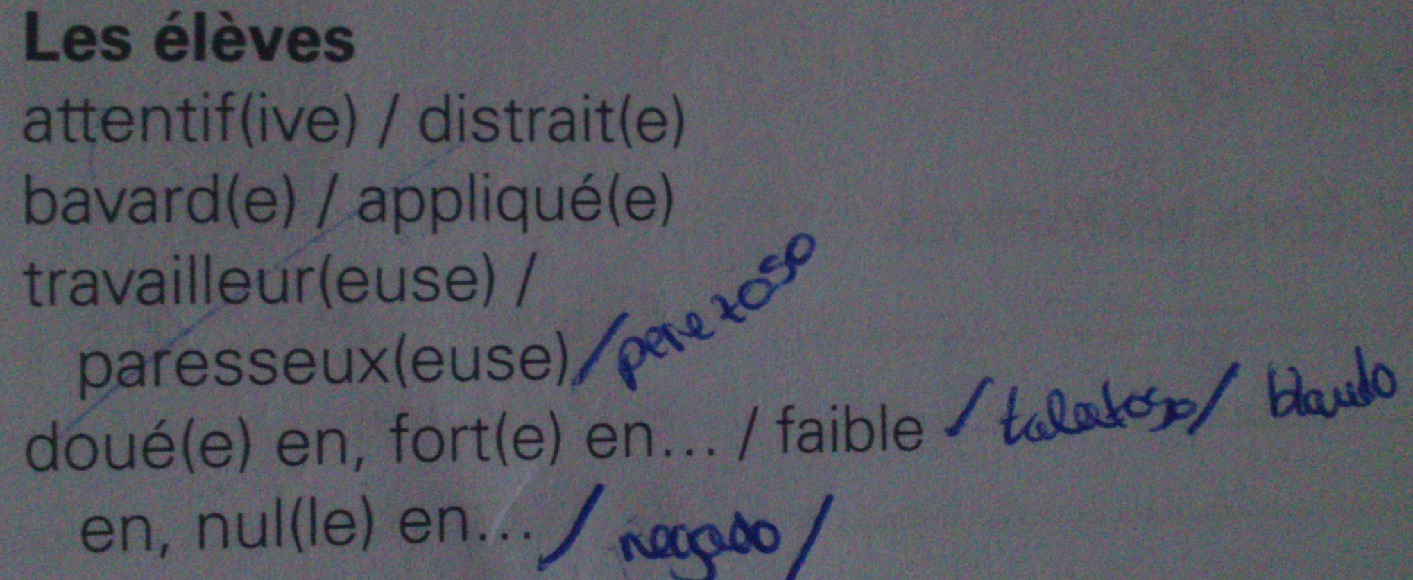 LES ACTIONSdiriger: dirigirsurveiller: vijlardonner un contrôle, une interro: hacer un examenmettre de bonnes/mauvaises notes: buenas y malas notascontrôler les absences, faire l'appel: pasar listapunir, coller: castigarapprendre( par coeur): estudiar de memoriaréviser, étudier, travailler: estudiarfaire des fiches: hacer los deberespréparer un exposé: preparar una exposicionécouter attentivement/ bavarder: escuchar atentamente/ charlarprendre des notes: tomar apunteslever le doigt: levantar la manopasser au tableau: salir a la pizarraêtre à l'heure/ arriver en retard: llegar a tiempo/ llegar tardemanquer les cours, être absent, sécher les cours: faltar a clase