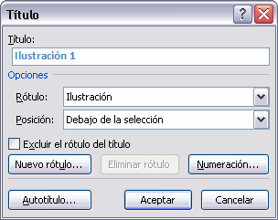 Tablas de ilustraciones y otras.También podemos incluir en nuestros documentos tablas de ilustraciones, gráficos o de tablas. Al igual que hemos visto que para crear índices y tabla de contenidos primero debemos marcar las entradas y después generar la tabla.De forma similar a como ocurría con la TDC tenemos dos opciones para marcar las entradas a la tabla de ilustraciones: -Utilizar los rótulos de ilustraciones predefinidos por Word.Para utilizar esta opción debemos seleccionar nuestra ilustración, ya sea tabla, imagen, gráfico, etc y acceder a la pestaña Referencias y pulsa el botón Insertar título.Nos aparece el diálogo Título que vemos en la imagen, como podemos ver el título se va a insertar en una tabla, aunque podemos asignarle el título a cualquier otro tipo de elemento.Al seleccionar la tabla, gráfico, imagen, ecuación, etc y seleccionar Título, Word lo detecta automáticamente y le asigna el título y el tipo de rotulo adecuado. La posición del título puede ser incluida encima de la selección o por debajo de la selección. Además vemos una serie de botones:- Nuevo rótulo... Este botón sirve para modificar el Título de la ilustración.- Numeración... Este botón nos abre el cuadro de diálogo que vemos en la imagen y sirve para modificar el estilo de la numeración de los títulos.Autotítulo... Este botón sirve para generar automáticamente los títulos de un determinado tipo. Por ejemplo podemos hacer que se generen automáticamente los títulos de las imágenes de mapa de bits (*.bmp) que vayamos incluyendo en el documento.