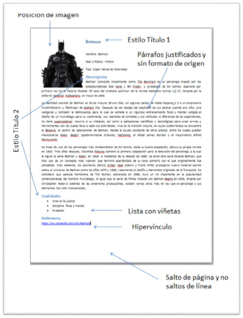 Notas · Habiendo insertado la imagen, en el menú Formato, asegúrese de que Ajustar texto tenga la opción En línea con el texto. En el mismo menú, seleccione la posición adecuada. · Los estilos se pueden seleccionar del menú inicio · Para quitar el formato de origen (fuente, tamaño, color, hipervínculos), al momento de pegar utilice el botón Solo texto o pegado especial, lista desplegable en el botón pegar. · Las viñetas se seleccionan en el menú inicio grupo párrafo. · Copie y pegue la dirección web (donde obtuvo la información del personaje), selecciónela, en el menú insertar seleccione hipervínculo · Para agregar salto de página, en el menú insertar En la siguiente página, un ejemplo de cómo quedaría cada uno de los personajes.