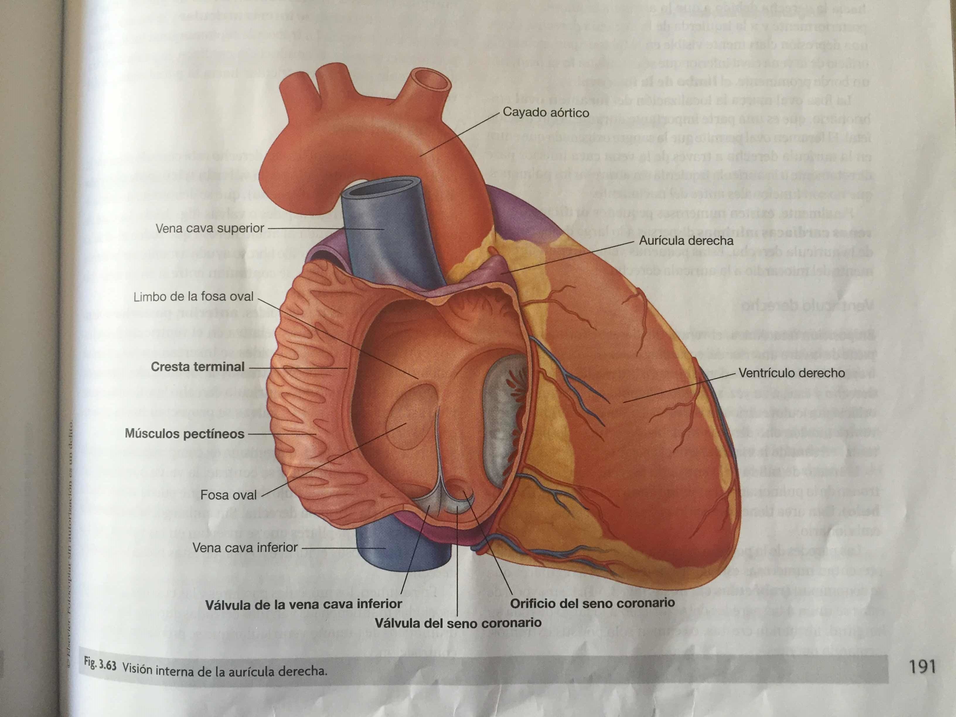 Descripción de la aurícula derechaLa sangre retorna a la aurícula derecha a través de 3 vasos: La vena cava inferior y superior; Y por el seno coronario (Seno coronario es dónde van a drenar la mayoría de las venas cardíacas).La aurícula derecha se divide en dos: Aurícula verdadera y seno de las venas cavas. Queda dividido así por una cresta (Llamada cresta terminal) que va desde la parte la parte anterior de la desembocadura de la cava superior hasta la parte anterior de la inferior. La cresta terminal queda marcada en la superficie del corazón por el surco terminal del corazón.La superficie interior de la aurícula verdadera está cubierta por músculos llamados músculos pectíneos.El orificio del seno coronario y de la vena cava inferior tienen pequeños tejidos que funcionan como válvulas (Válvula del seno coronario y válvula de la vena cava inferior respectivamente.Dividiendo a la aurícula derecha de la izquierda se encuentra el tabique interauricular, el cual en su pared contiene a la fosa oval (marca la localización del foramen oval, utilizado para transportar sangre oxigenada durante el desarrollo embrionario entre ambas aurículas.) rodeando la fosa oval se encuentra un pliegue (como labios) llamados limbo de la fosa oval.Y finalmente se encuentran los orificios de las venas cardíacas mínimas, los cuales rodean a la aurícula, drenando directamente del miocardio a la aurícula.