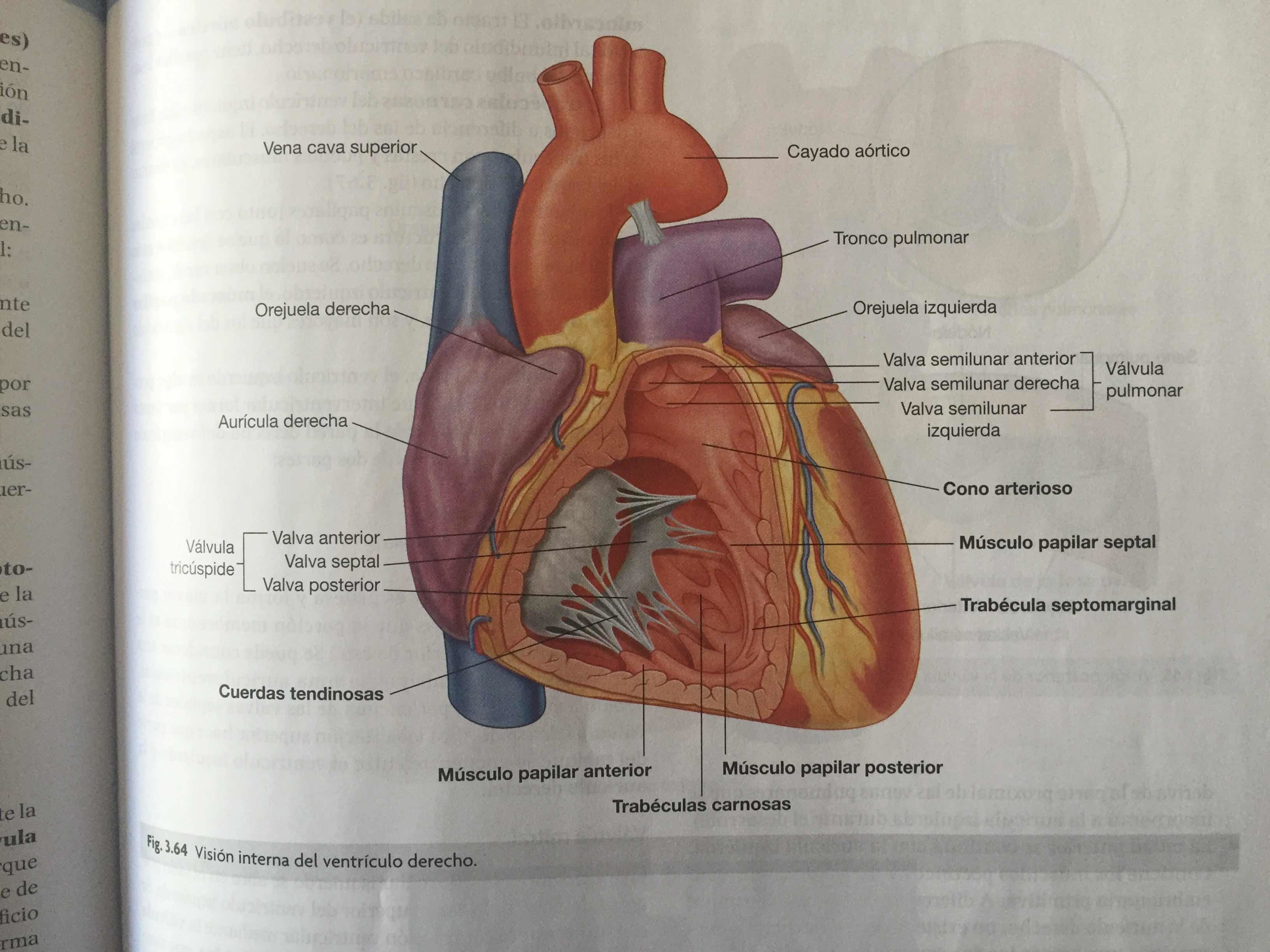 Descripción del ventrículo derechoTiene dos tractos: Uno de salida (Llamado Cono arterioso o infundíbulo, que es dónde origina el tronco pulmonar de las arterias pulmonares) y uno de entrada que es donde desemboca la válvula tricúspide.Las paredes de la porción de entrada están cubiertas de músculos irregulares llamados trabéculas.Las trabéculas unidas a cuerdas tendinosas (Que conectan con los bordes libres de la válvula tricúspide) se llaman músculos papilares.Hay tres músculos papilares: Músculo papilar anterior, músculo papilar septal y músculos papilar posterior.También hay una trabécula llamada trabécula septomarginal que va desde la parte inferior del tabique interventricular a la base del músculo papilar anterior.
