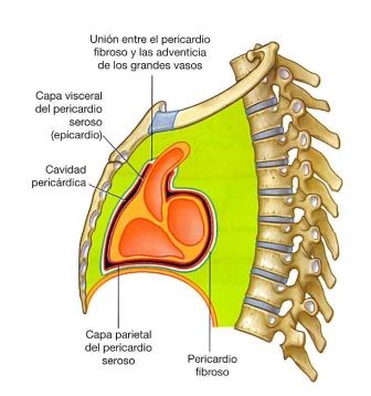 PericardioSaco fibroseróso que rodea al corazón y a la raíz de los grandes vasos. Su tamaño es de aproximadamente 12 cm de alto y 14 cm de ancho; el punto más alto del pericardio es la cresta de Haller.Tiene dos componentes El pericardio fibroso es una capa externa de tejido conjuntivo resistente que establece los limites del mediastino medio El pericardio seroso es fino y está formado por dos partes: la capa parietal que cubre la parte interna de la capa fibrosa y la capa visceral (epicardio) que se adhiere al corazón y forma su cubierta externa. La capa visceral y parietal son continuas, y entre ellas se forma una cavidad estrecha llamada cavidad pericardica y contiene una pequeña cantidad de liquido. Estas capas se continuan en torno a las raíces de los grandes vasos mediante dos flexiones: una superior en torno a las arterias y otra mas posterior en torno a las venas. Asi, se forman dos senos: seno oblicuo o fondo de saco de Haller, y el seno tranverso de Theile. Sus medios de fijación es a través de los ligamentos esternopericardicos, frenicopericardicos y vertebropericardicos o de Beraud.Esta irrigado por ramas pericardiofrenicas de las arterias mamarias internas y por ramas pericardicas de las arterias bronquiales esofágicas y frénicas superiores.Las venas del pericardio entran en el sistema de la vena ácigos y en las venas toracica interna y frénica inferior.Está inervado por el nervio vago (x), de los troncos simpáticos y de los nervios frénicos.