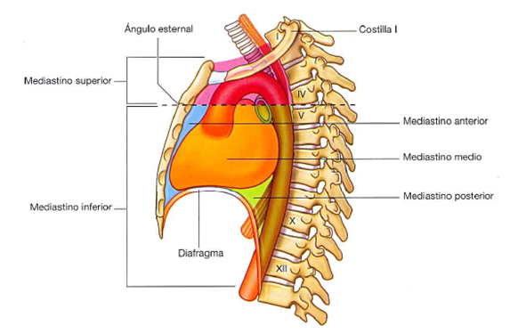 Torres Escamilla Irma GabrielaGrupo: 2311 MEDIASTINO. Es el espacio comprendido entre las dos regiones pleuropulmonares derecha e izquierda. Se extiende desde el orificio superior del tórax hasta el diafragma, desde el esternón hasta los cartílagos costales (delante) y las 12 vertebras dorsales (atrás). Está ocupado por una serie de órganos: Pericardio Corazón (con su grandes vasos) Tráquea Bronquios Esófago Nervios Ganglios linfáticos Profundamente situado entre los dos pulmones, cubierto, por delante, por la región esternal y por detrás por la región dorsal.Mediastino Superior.Región comprendida entre el orificio torácico superior y el ángulo esternal. A nivel de la 4ta. vertebra.Mediastino Inferior.Este se subdivide en 3 partes por el pericardio:Mediastino Medio.En el se ubica el corazón, ocupa la región comprendida entre el pericardio y la porción anterior de la bifurcación traqueal.Mediastino Posterior.Esta posterior al pericardio y al diafragma y anterior a los cuerpos vertebrales de las 8 vertebras dorsales inferiores.Mediastino anterior.Es la parte mas pequeña, se localiza anterior al pericardio fibroso.Material Audiovisual para revisar:https://www.youtube.com/watch?v=37orC0jq0vc https://www.youtube.com/watch?v=Vc8LJwa4CkQBibliografía: Testud L., Jacob O. Anatomía topográfica. Salvat. España. 1979.