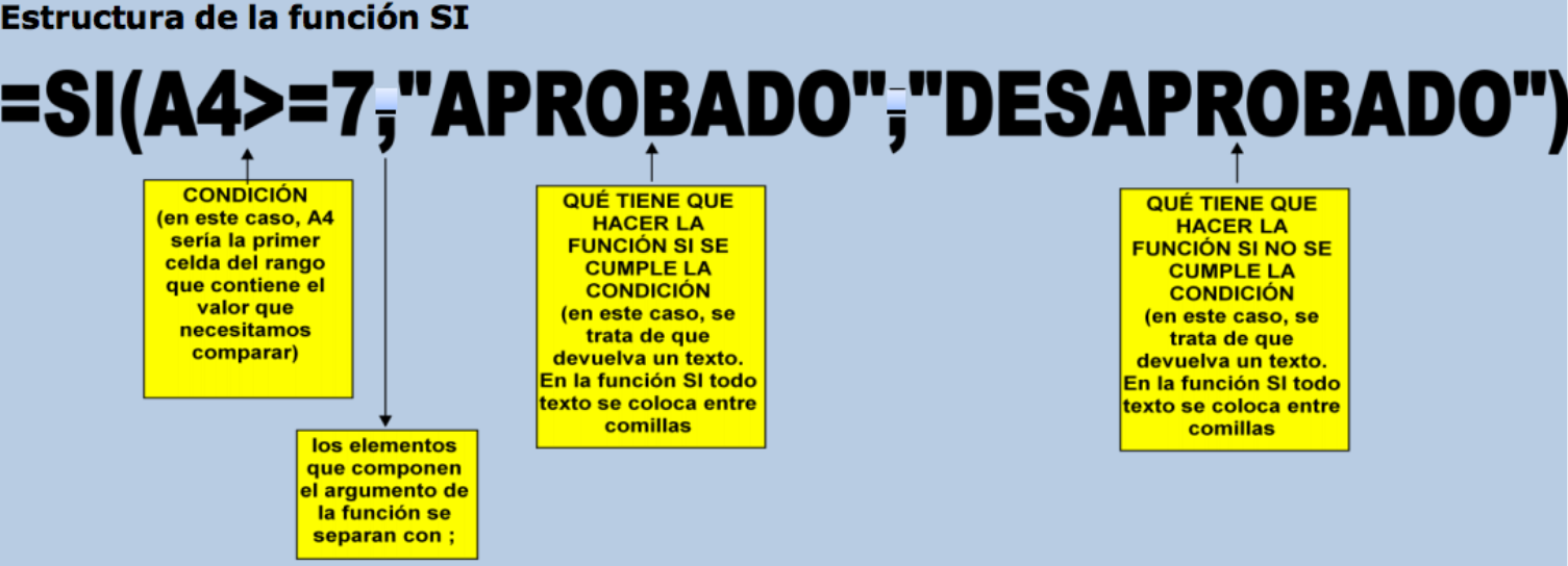FUNCIONES LÓGICAS: SILa función SI es una función lógica que, tal como su nombre lo dice, implica condiciones. Es decir que frente a una situación dada (condición) aparecen dos alternativas posibles: Si se cumple la condición, la función debe de devolver algo. Si no se cumple la condición, la función debe devolver otra cosa. Muchas veces, dentro de la función SI debemos hacer algún tipo de cálculo, porque necesitamos que devuelva un número.