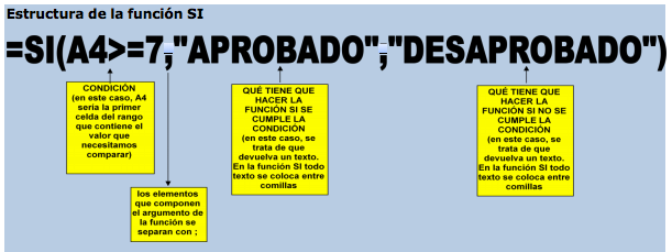 La función SI tal como lo indica su nombre implica ciertas condiciones , es decir que frente a una situación dada aparecen alternativas posibles.( puede tener dos resultados falso/verdadero). Si cumple la condición, la función debe devolver algo. Si no se cumple, la función debe devolver otra cosa. La función SI prueba la lógica, se usa para realizar pruebas condicionales que puede ser con valores o fórmulas.