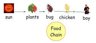 The plant is the producer, trapping energy from the sunlight. The bug and chicken are the first consumers, eating the plant. The boy is the second consumer, eating chicken´s meat.The arrows in the chain show how energy passes slong the chain from one level to the next.Most energy in the food you eat ends up as heat when you move, keep warm and breathe.heat: calor