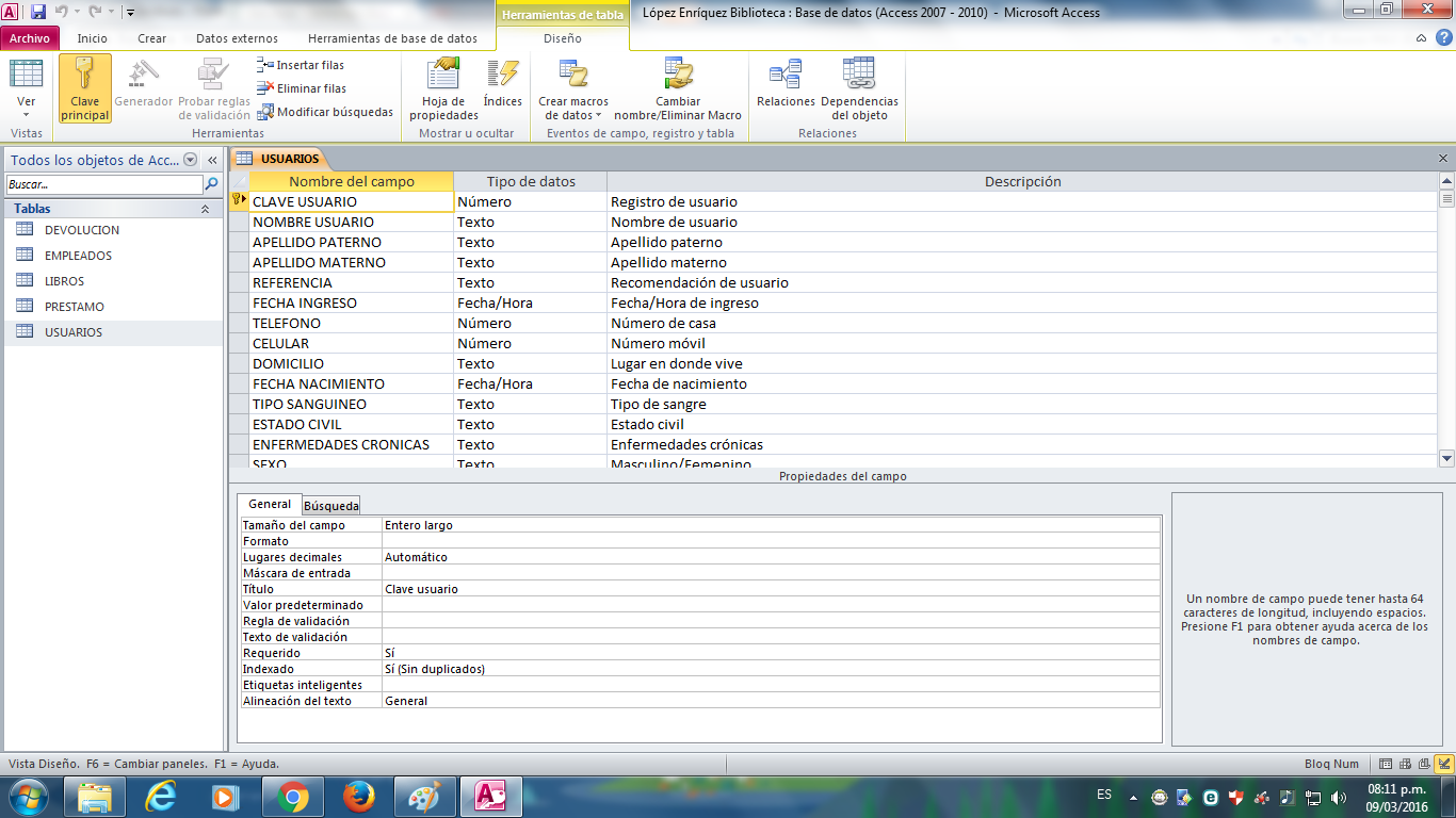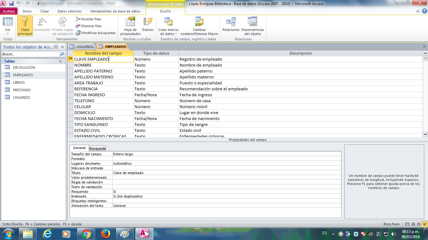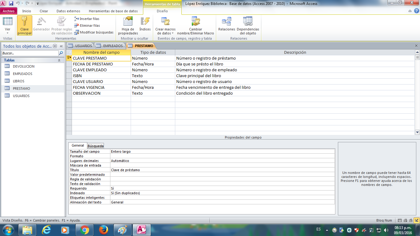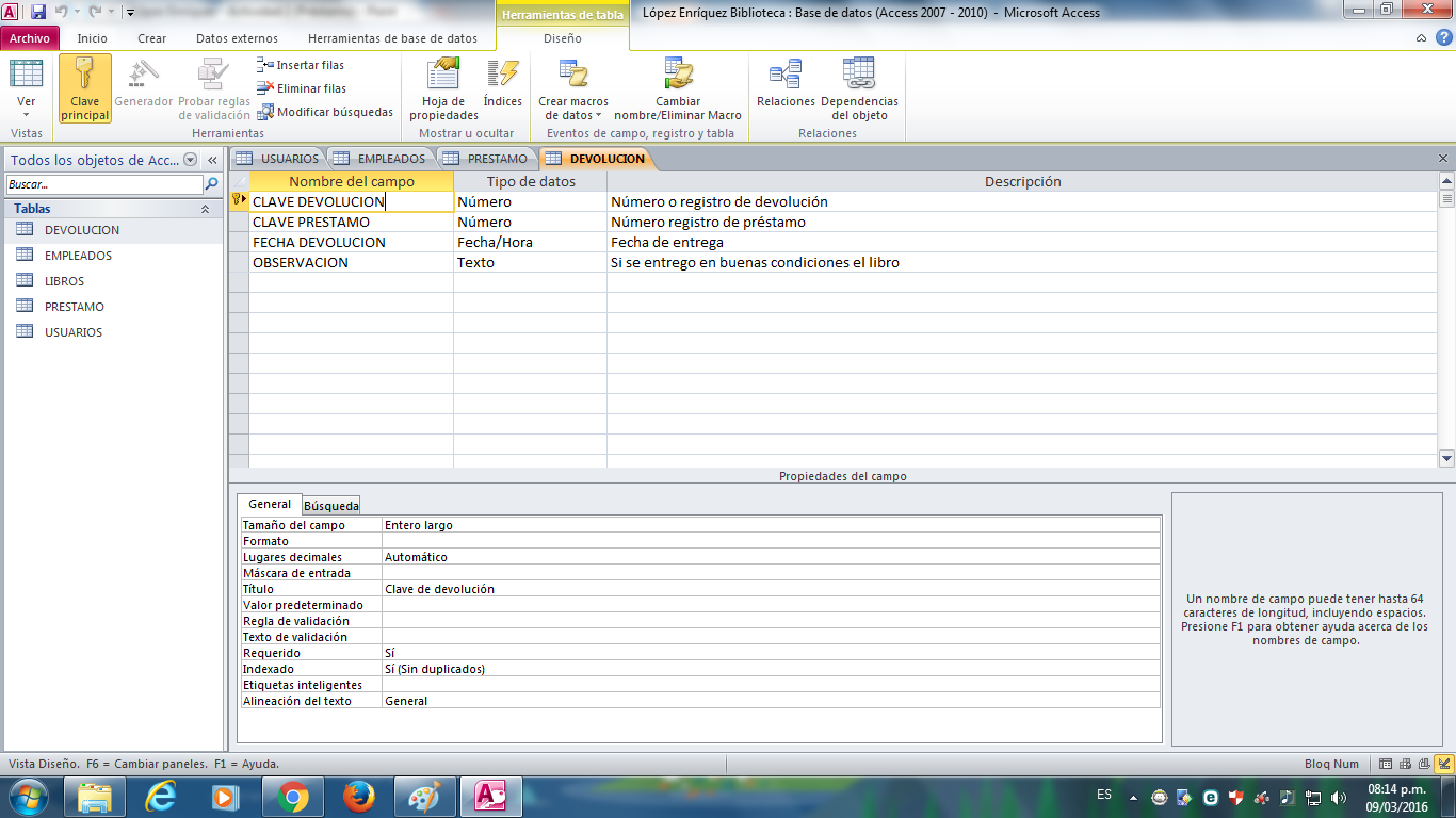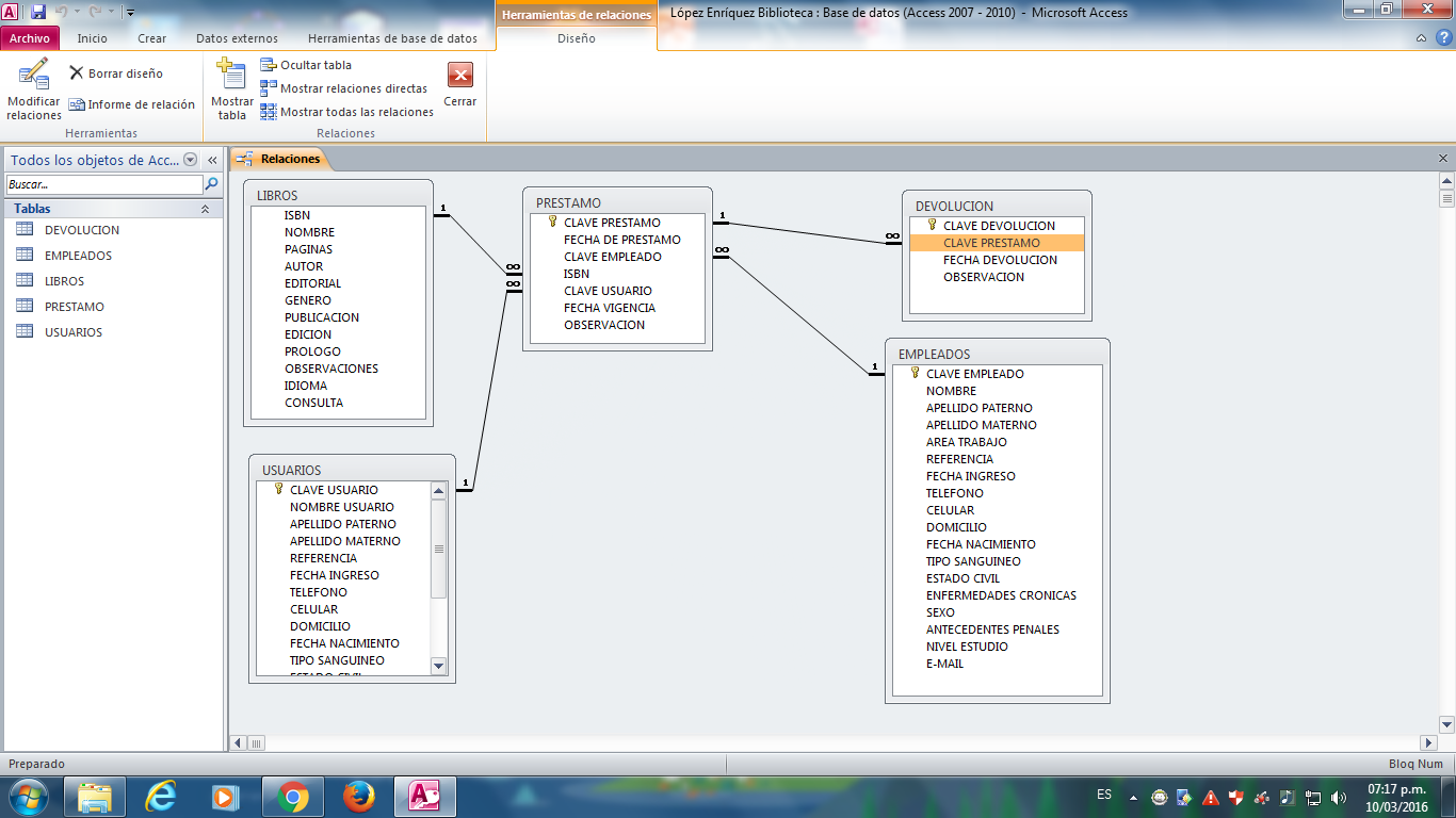 Evidencias de las tablas Usuario, Empleado, Préstamo, Devolución y Relaciones