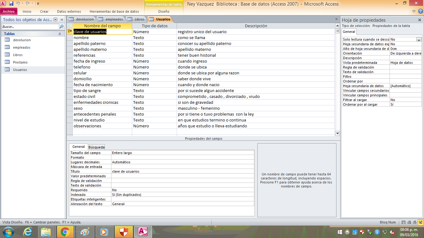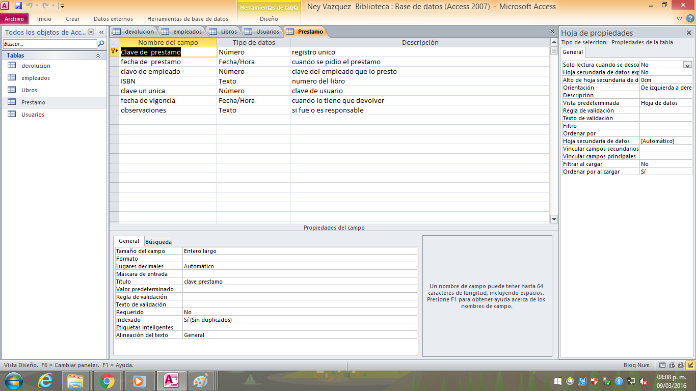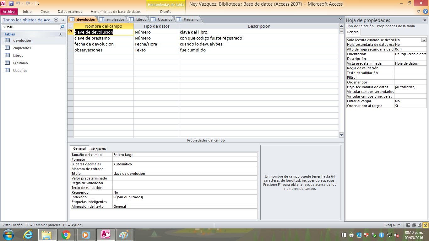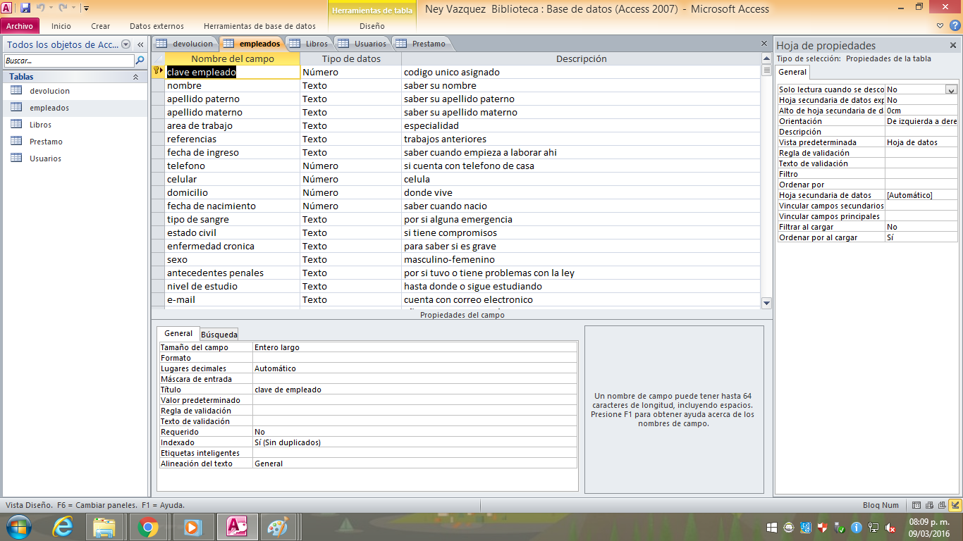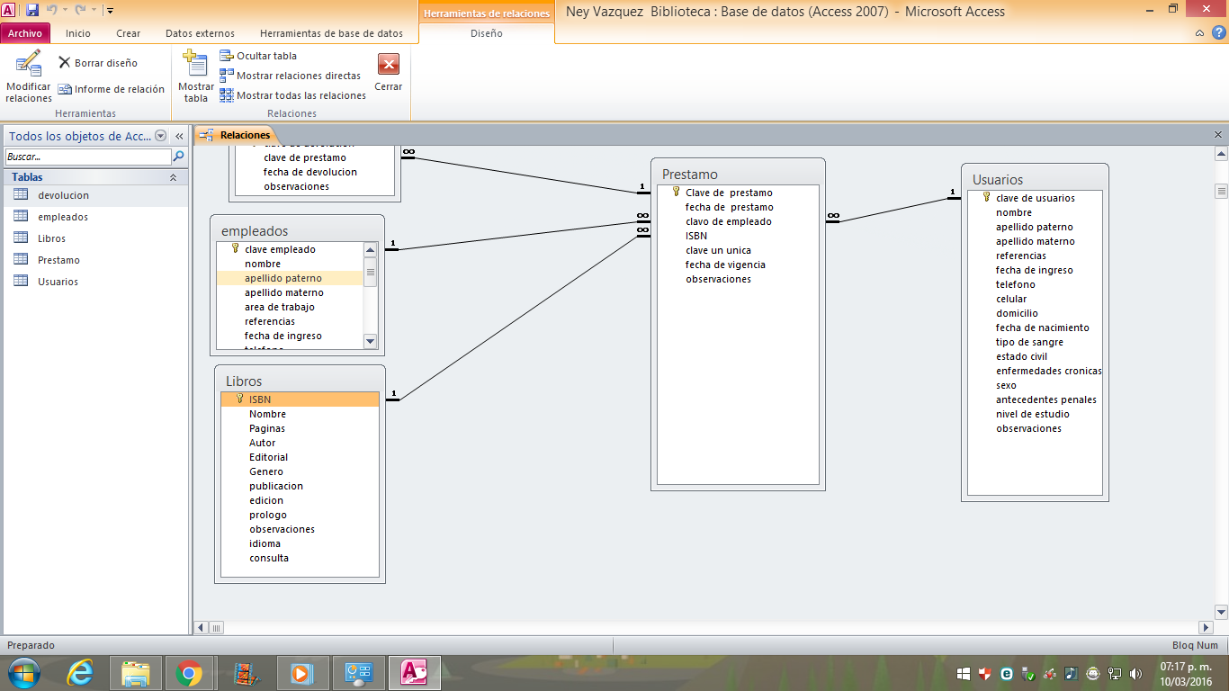 Tablas: Usuario, Empleados, Devoluciones, prestamo