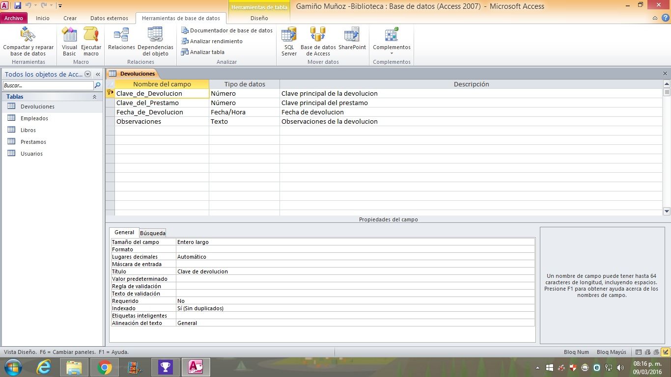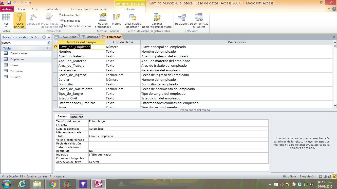 Tabla de creación de las tablas usuarios empleados prestamos devoluciones