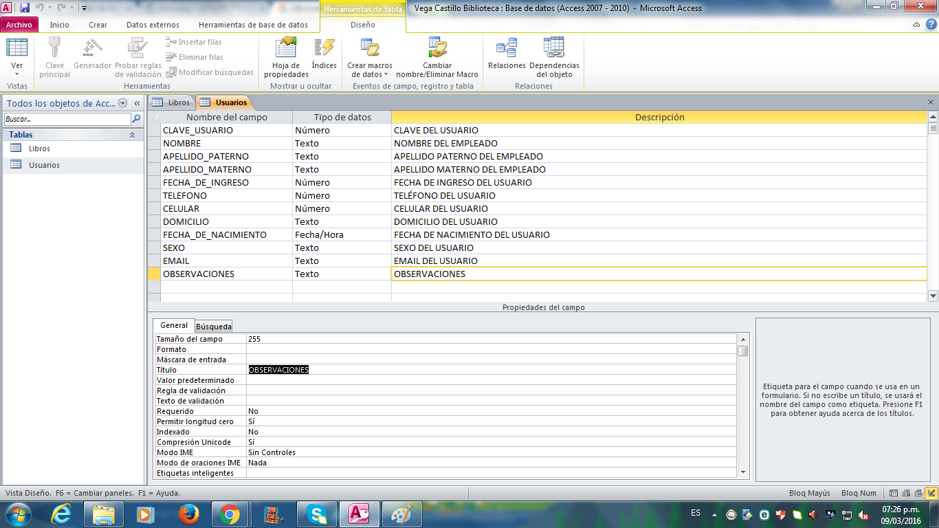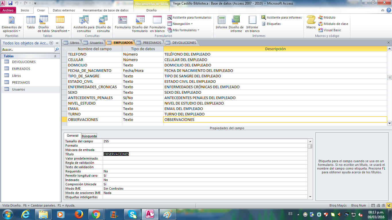 Tablas: Usuario, Empleados, Devoluciones, prestamo