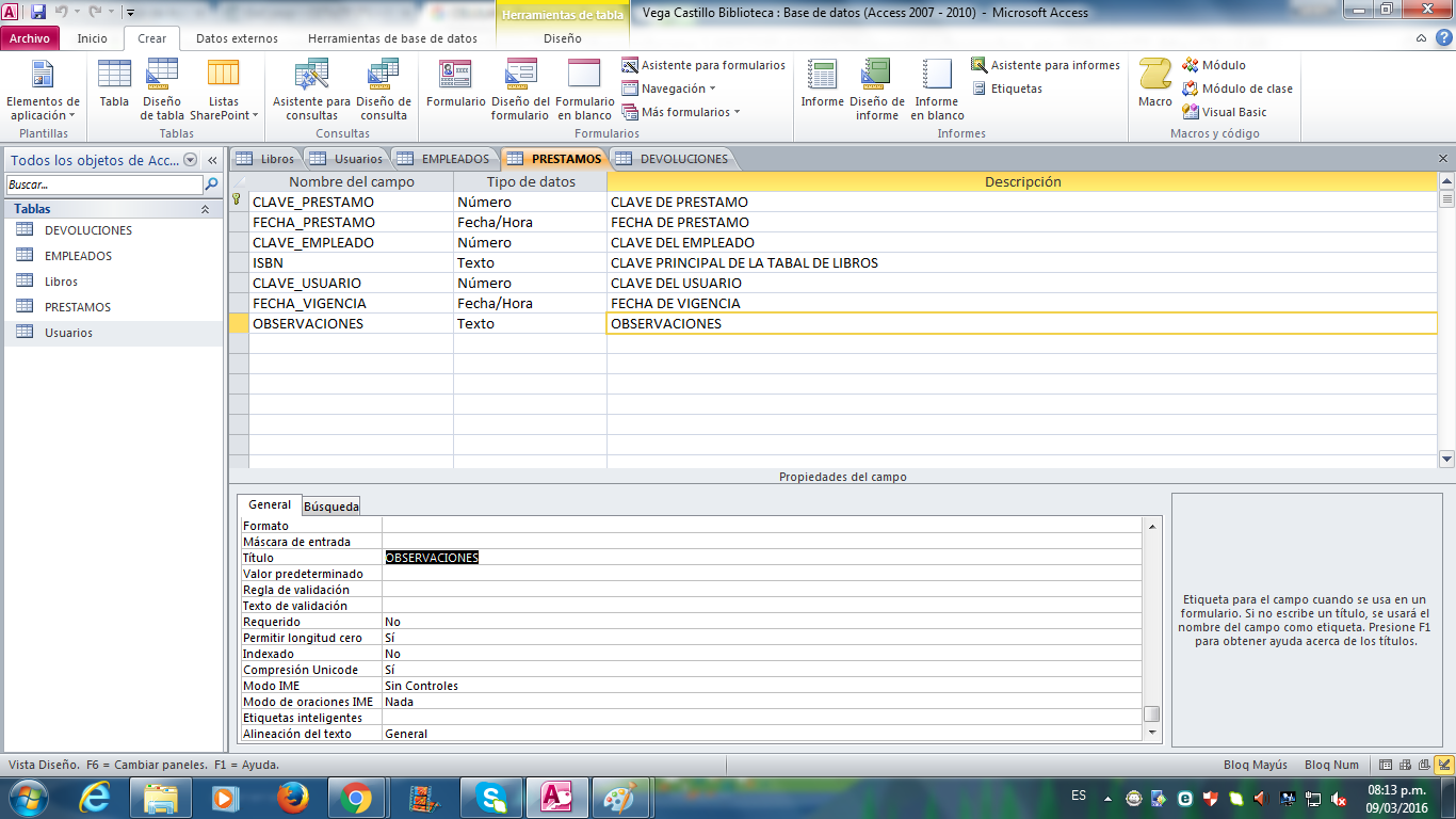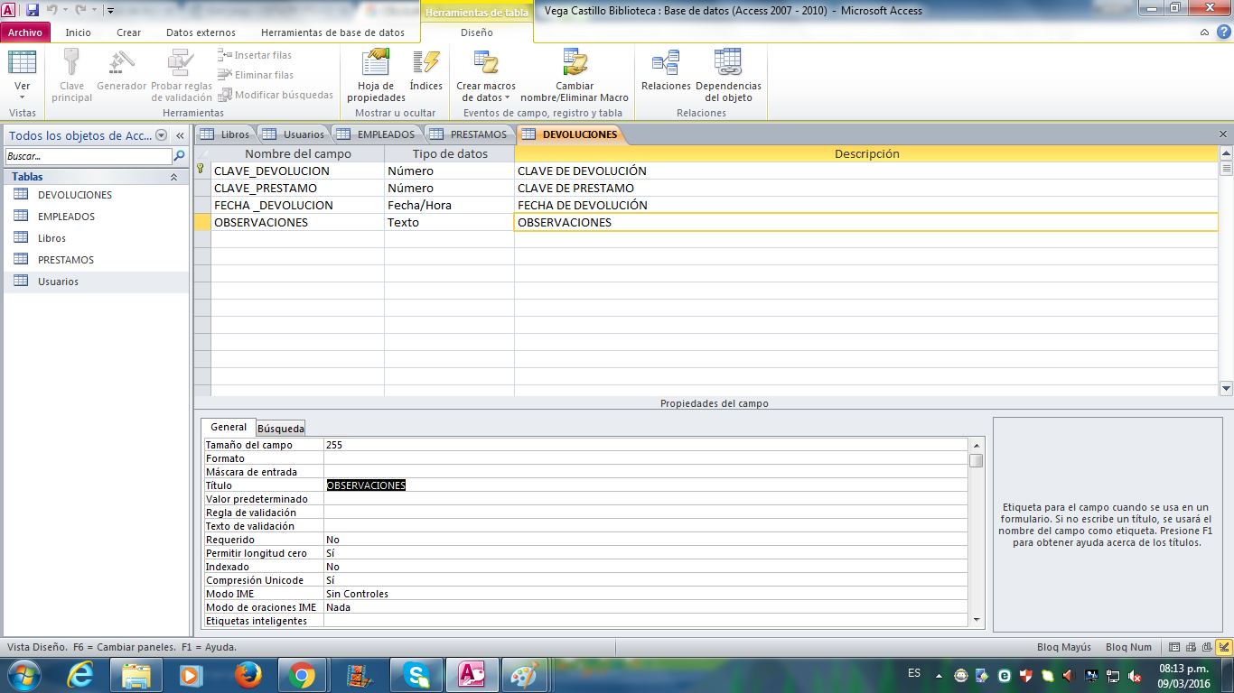 Evidencia de tablas empleado,usuario,préstamo,devoluciones y relaciones
