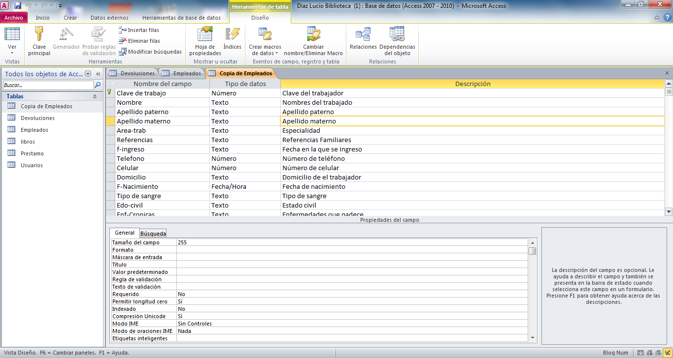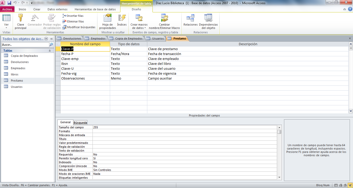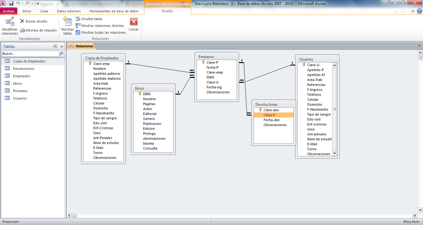Tablas: Usuario, Empleados, Devoluciones, prestamo