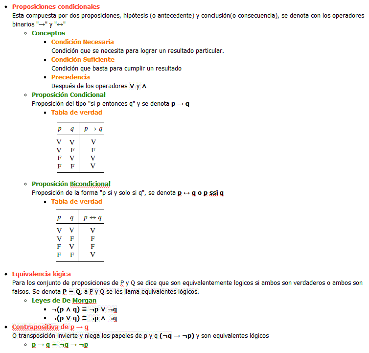 LógicaEstudio del razonamiento, si es correcto o falso, no se fija en el tema. Proposición Una oración declarativa que es verdadera o falsa pero no ambas. Es elemento básico de cualquier teoría de lógica y se denotan con p, q y r. Operador lógico BinarioAsigna a cada PAR de elementos de un conjunto X, un elemento de X. Conjunción de p y qEs la proposición p y q. Símbolo ∧, es verdadera si p y q son verdaderas. En programación se denota && Disyunción de p y qEs la proposición p o q. Símbolo ∨, es verdadera si p o q(o ambas) sean verdaderas. En programación se denota | | InclusivoSi ambas proposiciones son falsas, p o q es falsa Exclusivo, exorEs verdadera si p o q(pero no ambas) son verdaderas UnitarioAsigna a cada elemento de X, un elemento de X. Negación de pSímbolo ~p, niega la proposición p, se lee “no ocurre que” o “no”. En programación se denota ! PrecedenciaNegación > Conjunción > Disyunción