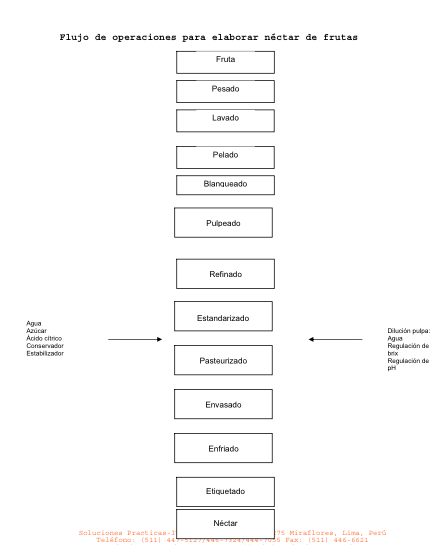 PROCESAMIENTO DE NÉCTARESDEFINICION:Se entiende por néctar al producto constituido por la pulpa de fruta finamente tamizada, con adición de agua potable, azúcar, ácido cítrico, preservante químico y estabilizador si fuera necesario. Existen dos aspectos importantes a considerar en la elaboración de néctares: Propiciar la destrucción de las levaduras que podrían causar fermentación, así como hongos y bacterias que podrían originar malos sabores y altercaciones. Conservar en el producto el sabor de la fruta y su poder vitamínico. Materia prima e insumos Materia prima: En néctar deberá ser extraído de frutas maduras, sanas y frescas, convenientemente lavadas y libres de restos de plaguicidas y otras sustancias nocivas, en condiciones sanitarias apropiadas. Una de las ventajas de la elaboración de este producto es que la forma de procesamiento permite el empleo de frutas que no son adecuadas para otros fines por su forma y tamaño. Insumos: Azúcar: Se emplea para dar al néctar el dulzor adecuado. La concentración del azúcar en solución se puede medir mediante un instrumento llamado refractómetro que da los grados Brix (porcentaje de sólidos solubles) o mediante un densímetro en grados Baumé o Brix. Ácido cítrico: Es usado para regular la acidez del néctar y se expresa normalmente como pH. Estabilizador: Se utiliza para evitar la separación de los sólidos y/o darle cuerpo al néctar. El estabilizador más empleado es la carboximetilcelulosa. Preservantes: Un preservante es cualquier sustancia que añadida a un alimento previene o retarda su deterioro. Entre ellos encontramos: metabisulfito de sodio, sorbato de potasio y benzoato de sodio. Los dos últimos son agentes que actúan contra levaduras, bacterias y mohos y pueden emplearse en concentraciones de hasta 0.1%.Proceso de Elaboración El proceso de elaboración del néctar tiene las siguientes partes: Pesado: Esta operación permitirá determinar rendimientos. Selección: En esta operación se eliminan aquellas frutas magulladas y que presentan crecimiento de hongos. Lavado: Se hace para eliminar cualquier partícula extraña que pueda estar adherida a la fruta. Se puede realizar por inmersión, agitación, aspersión o rociada. Una vez lavada la fruta se recomienda una desinfección para eliminar microorganismos, para lo cual se sumerge la fruta en una solución de TEGO 51 al 0.1% de 3 a 15 min. O en cualquier otro desinfectante. Pelado: Dependiendo de la materia prima esta operación puede ejecutarse antes o después de la precocción o blanqueado. Las frutas son pulpeadas con su cáscara siempre y cuando ésta no tenga ninguna sustancia que al pasar a la pulpa le ocasione cambios en sus características organolépticas. El pelado se puede hacer en forma manual, empleando cuchillos o en forma mecánica. También con sustancias químicas como el hidróxido de sodio o soda o con agua caliente o vapor. Los recipientes y utensilios que se emplean en el pelado químico deberán ser de acero inoxidable o de barro, pues la soda es corrosiva. La fruta debe sumergirse el tiempo justo y luego extraerse y lavarse con agua corriente. Si no se lava bien la superficie de la fruta, esta se oscurecerá rápidamente. Blanqueado o precocción: El objeto de esta operación es ablandar la fruta para facilitar el pulpeado. Se realiza generalmente en agua en ebullición o con vapor directo por espacio de 3 a 5 minutos. El blanqueado sirve también para inactivar las enzimas ( un tipo de proteína) que presentan las frutas y que son responsables del oscurecimiento o pardeamiento en las mismas así como de cambios en el sabor y pérdidas en el valor nutritivo. Pulpeado: Consiste en obtener la pulpa de las frutas libres de cáscaras y pepas. A nivel industrial esta operación se realiza en pulpeadoras. A nivel semiindustrial o artesanal se puede realizar utilizando una licuadora. Refinado: Consiste en pasar la pulpa a una segunda etapa de pulpeado, utilizando una malla que elimina toda partícula de la pulpa mejorando el aspecto de la misma. Estandarizado: Esta operación involucra lo siguientes: Dilución de la pulpa con agua Regulación del pH Regulación de los grados Brix ( contenido de azúcar) Adición del Estabilizador Adición del preservante Dilución de la pulpa con agua: la dilución depende de la pulpa.La regulación del pH se debe de llevar a un nivel menor de 4.5 pues una acidez alta favorece la destrucción de los microorganismos; el pH al que se debe de llevar el néctar depende también de la fruta. La regulación del pH se hace mediante la adición de ácido cítrico. La regulación de la cantidad de azúcar se realiza mediante la adición de azúcar blanca refinada. Para lo relacionado a la adición del estabilizador la dosis puede alcanzar hasta un máximo de 0,5%. Y la adición del preservante se admite un máximo de 0,1% empleándose el sorbato de potasio o el benzoato de sodio. Pasteurizado: Esta operación consiste en un tratamiento térmico, en el que se somete al néctar a una temperatura y tiempo determinados dependiendo del equipo utilizado. Existen dos métodos de pasteurización: Tratamiento térmico corto: Aquí el néctar es sometido a una temperatura de 97 grados centígrados por 30 segundos en un pasteurizador de placas que luego debe enfriarse lo más rápidamente posible. El cambio brusco de temperatura será el que propicie la destrucción de los microorganismos. Tratamiento térmico largo: se realiza a una temperatura de 71 grados centígrados por 30 minutos. Envasado: Para el envasado del néctar se puede utilizar envases de vidrio o de plástico. El envasado se debe hacer en caliente a una temperatura no menor de 85 grados centígrados, cerrándose el envase inmediatamente. Enfriado: El producto envasado debe ser enfriado rápidamente para reducir las pérdidas de aroma, sabor y consistencia del producto, conservando así su calidad.Defectos en la elaboración de néctares: Fermentación: 