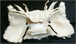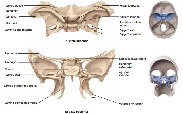 EsfenoidesAloja a los dos senos efenoidales (recuiertos de mucosa y separados por un tabique). Su parte anterior forma la parte denominada "silla turca". La silla turca aloja a la glándula hipófisis. Está situada dos centímetros por delante y dos por encima del meato auditivo interno. Dorsal-mente la silla turca ésta limitada por la lámina cuadrilátera del esfenoides, que en sus ángulos supriores presenta unos salientes denominados "apófisis clinoides" posteriores. En la porción anterior de la silla turca stá el tubérculo pituitario. Por delante de este tubérculo, en la parte más anterior de la cara superior del cuero esfenoides esta la eminencia esfenoidal. Entre el tubérculo y la eminencia queda un espacio denominado surco quiasmático, donde se encuentra el quiasma óptico.