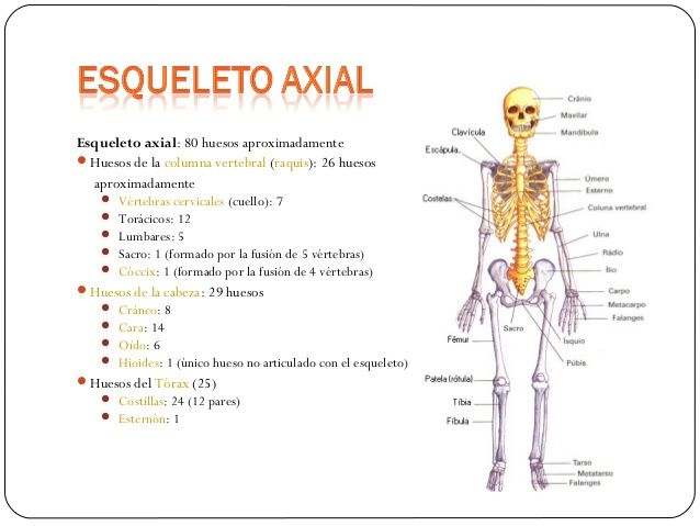 Hay 206 huesos, de los cuales 205 están interconectados entre sí, el ultimo es un hueso inconexo llamado HIODES.Esqueleto AxialFormado por los huesos de: Cráneo Cara Columna vertebral Toráx