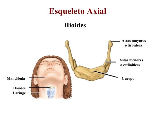 Hueso hioides: hueso impar, medio simétrico, situado en la parte anterior del cuello, por debajo de la lengua y por encima del cartílago tiroides. Tiene forma de herradura, siendo convexo hacia delante, cóncavo por detrás.