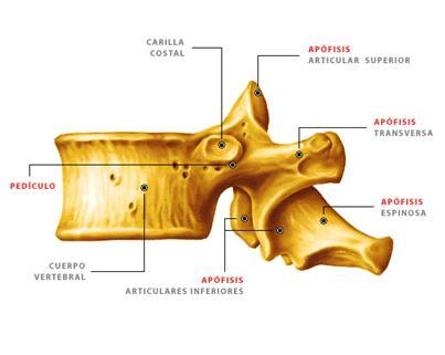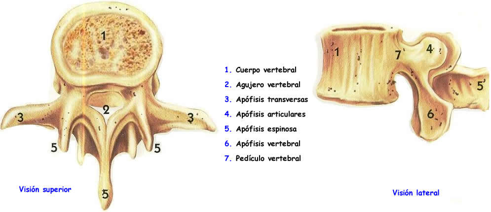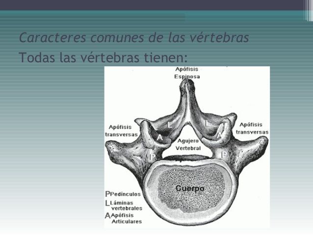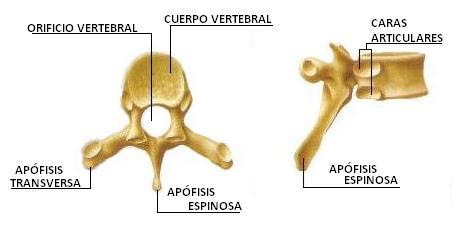 Todas las vertebras tienen: Un cuerpo: con forma de cilindro de dos caras y una circunferencia. Un agujero: comprendido entre la cara posterior del cuerpo vertebral y la apófisis espinosa. Una apófisis espinosa: impar y media, se dirige hacia abajo Forma de larga espina, presenta: Una base el vértice Borde superior Borde inferior Dos caras laterales Apófisis transversas: Una derecha y otra izquierda, se dirige hacia afueraPresenta: Una base. El vértice. Borde superior e inferior Cara anterior y posterior. Apófisis articulares: Son dos eminencias destinada a la articulación de las vertebras entre sí, son 4 dos ascendentes y dos descendentes, colocadas a cada lado del agujero vertebral. Láminas vertebrales: En número de dos, derecha e izquierda. Aplanadas y cuadriláteras, forman la mayor parte de la pared posterolateral del agujero vertebral. Pedículos: Son dos porciones oseas delgadas y estrechas que a uno y otro lado, unen la base de las apófisis transversas y las apófisis articulares.