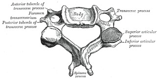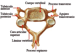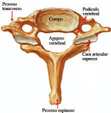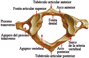 Atlas: Es la primera vertebra cervical, se une al huso occipital, da paso al tallo cerebral a través del agujero "magnum". Está constituida por dos masas laterales unidas por dos arcos, todas estás partes circunscriben el agujero del occipital. El atlas es una vertebra incompleta, no posee cuerpo vertebral, la apófisis espinosa está representada por el tubérculo posterior, las apófisis articulares por las cavidades glenoideas y las láminas por el arco posterior.