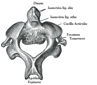 Axis: es la segunda vertebra cervical, se articula por arriba con el atlas y por debajo con la 3ra vertebra cervical, presenta una eminencia denominada apófisis odontoides que puede ser considerada como su cuerpo, la apófisis espinosa es muy ancha, las apófisis transversas son muy cortas.