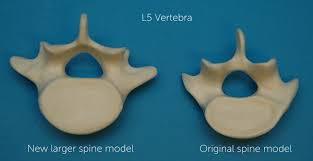 Décima dorsal: Su carácter distintivo es la existencia de una sola semicarilla, situada en la parte superior del cuerpo, para la décima costilla.Undécima y duodécima dorsal: Se aproximan a las vértebras lumbares, ausencia de carillas articulares en las apófisis transversas. Presencia de una carilla única a cada lado del cuerpo, para las costillas undécima y duodécima.Vertebras lumbaresPresentan el cuerpo mas voluminoso de todas las vertebras, sus laminas son alargadas, las apófisis espinosas mas rectangulares y horizontales, apófisis transversas son largas y delgadas y parecen ser como costillas, su agujero vertebral es triangular.
