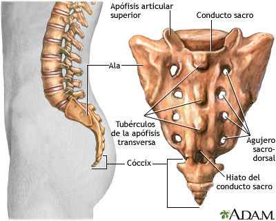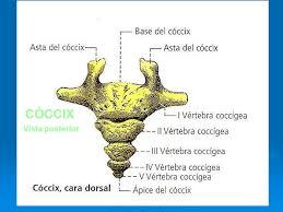 Coxis (cóccix)También es producto de la fusión de varios huesos se articula por encima con el sacro y el resto del hueso esta al aire, es un hueso plano en forma triangular, tiene en su base que es superior las llamadas astas menores.