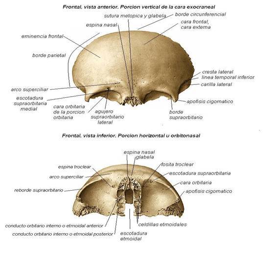 FrontalSe encuentra en la parte anterosuperior por delante de los huesos parietales y un poco por arriba del esfenoides, y montado sobre el etmoiddes, y el hueso d la cara. El hueso frontal ocupa la superficie de la cara que se corresponde con la frente y prominencia cubierta por las cejas.