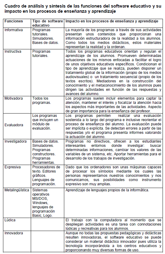 Funciones específicas del Software Educativo y su impacto en los procesos de enseñanza y aprendizaje.No se puede afirmar que el software educativo sea por sí mismo bueno o malo. Todo depende del uso educativo que el profesor disponga, de la manera en que sea utilizado en cada situación educativa concreta. Su funcionalidad y las ventajas o desventajas que implique su uso, en último término remiten a las características del material; a su capacidad de adecuarse al contexto educativo en el que se lo utiliza y al estilo de enseñanza del profesor. Depende del profesor cómo se organice la utilización del recurso.