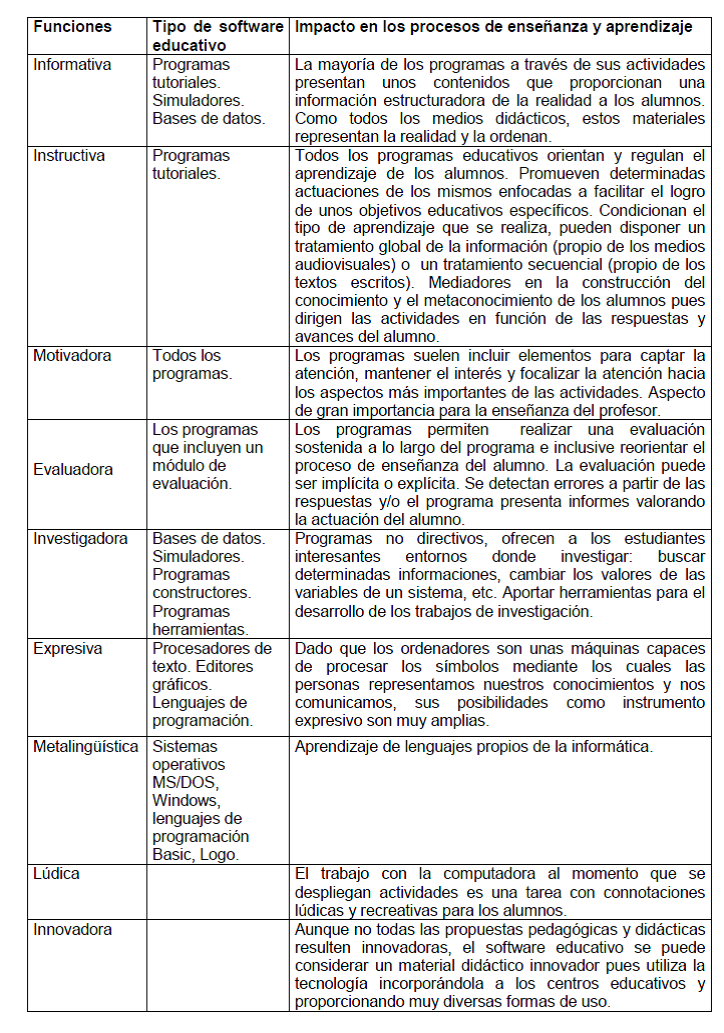 Al igual que otros productos de la tecnología educativa actual, no se puede afirmar que el software educativo sea por sí mismo bueno o malo. Todo depende del uso educativo que el profesor disponga, de la manera en que sea utilizado en cada situación educativa concreta Las funciones que pueden realizar los programas educativos y el impacto que provocan en los procesos de enseñanza y aprendizaje es muy diverso.