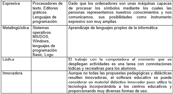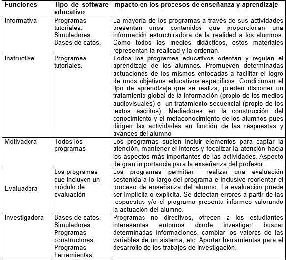 No se puede afirmar que el software educativo sea por sí mismo bueno o malo. Todo depende del uso educativo que el profesor disponga, de la manera en que sea utilizado en cada situación educativa concreta. Las funciones que pueden realizar los programas educativos y el impacto que provocan en los procesos de enseñanza y aprendizaje son muy diversos.