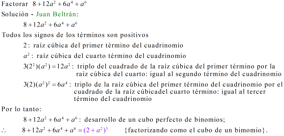 P r o c e d i m i e n t o : El desarrollo del cubo de un binomio es: En esta clase de ejercicios se nos da una expresión como el miembro derecho de las identidades anteriores, es decir un cuadrinomio; y debemos constatar si se trata de un cubo perfecto de binomios (como los miembros izquierdos de las expresiones anteriores); para lo cual debemos proceder de la siguiente manera: 1. Se ordena el cuadrinomio en forma descendente o ascendente respecto a una letra 2. Se extrae la raíz cúbica del primero y cuarto términos del cuadrinomio 3. Se observa si todos los signos son positivos o si se alternan positivo-negativo-positivo-negativo 4. Se triplica el cuadrado de la raíz cúbica del primer término por la raíz cúbica del cuarto término y se compara con el segundo término del cuadrinomio dado 5. Se triplica la raíz cúbica del primer término por el cuadrado de la raíz cúbica del cuarto término y se compara con el tercer término del cuadrinomio dado 6. Si las dos comparaciones hechas en los pasos 4 y 5 son positivas, se trata del desarrollo del cubo de un binomio y se factoriza como tal: dentro de un paréntesis se escriben las raíces cúbicas del primero y cuarto términos del cuadrinomio y separadas por el signo más o por el signo menos, según el caso; y se eleva al cubo el paréntesis 7. Si las dos comparaciones hechas en los pasos 4 y 5 son negativas, no se trata del desarrollo del cubo de un binomio y no se puede factorizar como tal.
