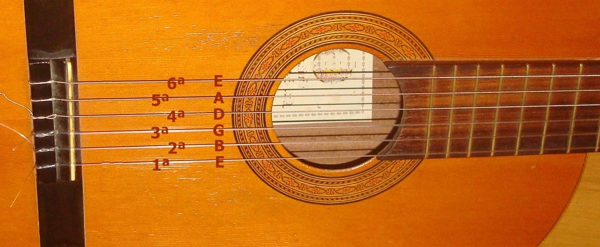 Bueno, si queremos aprender a tocar la guitarra tenemos que conocer las partes o elementos que constan de ella. Cuerdas La guitarra consta de seis cuerdas que toman su nombre según el sonido que producen cuando se tocan al aire (sueltas) y se enumeran de abajo hacia arriba, tomando como referencia la posición normal en que se toma la guitarra para tocar. La cuerda más delgada es la número 1 y la más gruesa es la 6ta.