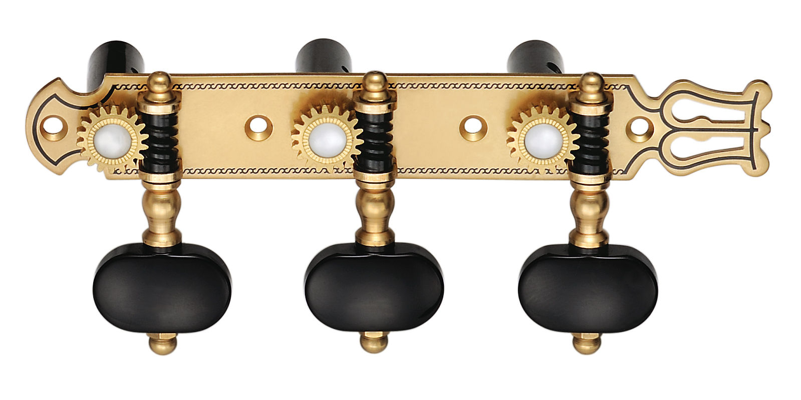 Clavijero Su función es la de sostener y tensar las cuerdas, para ello consta de un mecanismo compuesto por tornillos sinfín que hacen girar un eje donde van enrolladas las cuerdas. La Cejuela (Superior) Es una pieza de forma alargada controla la altura de las cuerdas al aire sobre el primer traste. Mástil - Diapasón Es una pieza de ébano alargada de forma aplanada que cubre el Mástil, Esta dividido en espacios delimitados por unas barras de metal incrustadas llamadas Trastes,Cada espacio (o traste) representa una nota musical.