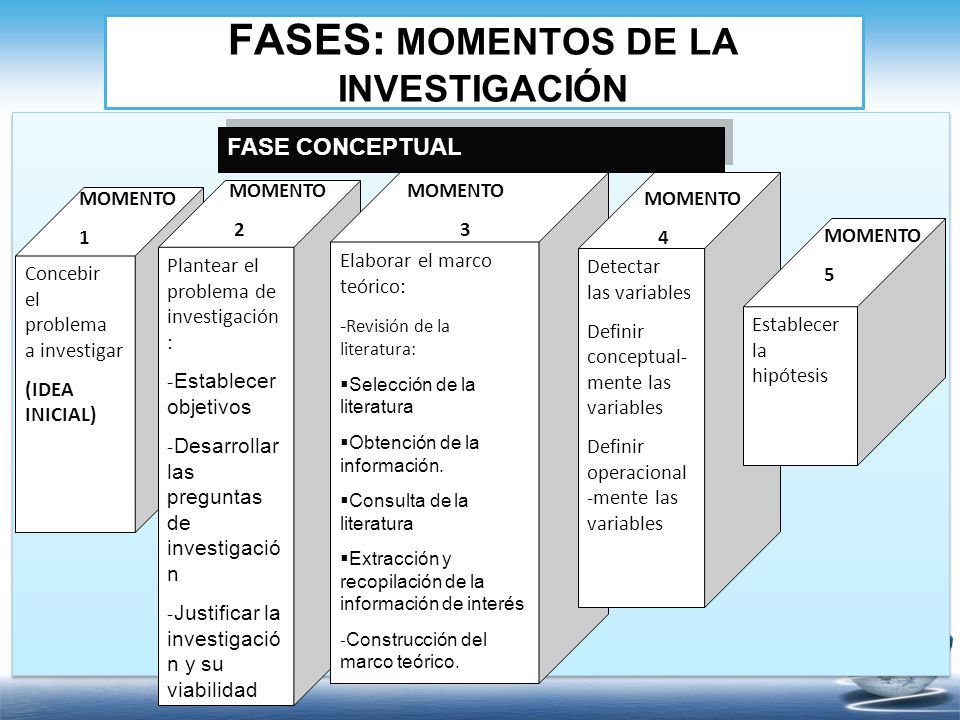 1. FASE CONCEPTUAL En esta fase se debe ordenar y sistematizar las inquietudes, preguntas, y elaborar organizadamente los conocimientos que constituyen el punto de partida. Los siguientes momentos son de carácter conceptual o intelectual e implican pensar, leer, reformular sus inquietudes, proponer teorías y revisar conceptos: